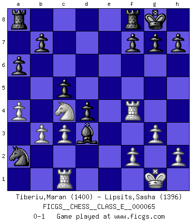 Last move : 0-1 2007 November 13 22:21:39 [Event "FICGS__CHESS__CLASS_E__000065"] [Site "FICGS"] [Date "2007.10.28"] [Round "1"] [White "Tiberiu,Maran"] [Black "Lipsits,Sasha"] [Result "0-1"] [WhiteElo "1400"] [BlackElo "1396"] 1.e4 e6 2.d3 d5 3.Nf3 c5 4.exd5 exd5 5.Bf4 Nf6 6.Be2 Bd6 7.Bxd6 Qxd6 8.Nc3 d4 9.Nb5 Qb6 10.a4 O-O 11.b3 a6 12.Na3 Nd5 13.Nc4 Qe6 14.O-O Nc3 15.Qd2 Qxe2 16.Rfe1 Qxd2 17.Nfxd2 Nc6 18.Ne4 Nxe4 19.Rxe4 Bf5 20.Rf4 Bg6 21.g3 Nb4 22.Rc1 Bxd3 23.c3 Na2 0-1 French : King's Indian attack Kingside Castling by player Black (move 10) Kingside Castling by player White (move 14) Player Black won this chess game. Follow this game move after move (download)As one by one I mowed them down, my superiority soon became apparent. (Jose Capablanca) Bis jetzt ist Weiß einer wohlbekannten Analyse gefolgt. Aber jetzt begeht er einen schrecklichen Fehler: Er beginnt seinen eigenen Kopf zu benutzen. (Siegbert Tarrasch) Hay jugadores fuertes y personas amables y yo soy un jugador fuerte. (Bobby Fischer) Votre prénom est 'Tactique', votre deuxième prénom est 'Tactique' et votre nom est 'Tactique'. (Ken Smith) Creativity is allowing yourself to make mistakes. Art is knowing which ones to keep. (Scott Adams)