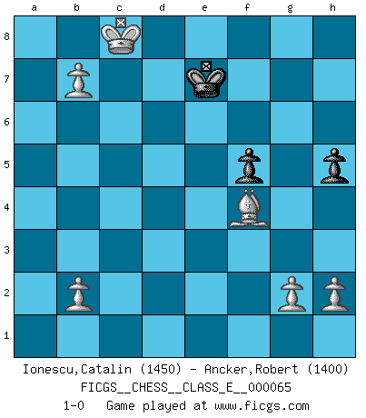 Last move : 1-0 2008 May 7 0:3:31 [Event "FICGS__CHESS__CLASS_E__000065"] [Site "FICGS"] [Date "2007.10.28"] [Round "1"] [White "Ionescu,Catalin"] [Black "Ancker,Robert"] [Result "1-0"] [WhiteElo "1450"] [BlackElo "1400"] 1.e4 e5 2.Nf3 Bc5 3.Nxe5 Bxf2+ 4.Kxf2 Qf6+ 5.Nf3 Qb6+ 6.d4 Nf6 7.Nc3 c5 8.dxc5 Qxc5+ 9.Qd4 Qxd4+ 10.Nxd4 O-O 11.Be2 b6 12.Bf3 Nc6 13.Nxc6 dxc6 14.e5 Nd7 15.Bxc6 Rb8 16.Bxd7 Bxd7 17.Bf4 Rbc8 18.a3 Bc6 19.Rad1 Ba8 20.Rhe1 Rcd8 21.Rxd8 Rxd8 22.Rd1 Rc8 23.Rd7 Bc6 24.Rxa7 b5 25.Nd1 Ba8 26.c3 b4 27.axb4 Bc6 28.Ne3 f6 29.exf6 gxf6 30.Nf5 Rd8 31.Bh6 Bd7 32.c4 Bxf5 33.c5 Rd7 34.Rxd7 Bxd7 35.Ke3 f5 36.Kd4 Kf7 37.Kd5 Kg6 38.Bf4 Kf7 39.Kd6 Ba4 40.c6 Bb5 41.c7 Ba6 42.Kd7 Bb7 43.c8Q Bxc8+ 44.Kxc8 Ke8 45.b5 Ke7 46.b6 h5 47.b7 1-0 King's knight Opening Kingside Castling by player Black (move 10) Promotion Queen by player White (move 43) 10 pieces endgame at move 43 : White KBPPPP , Black KBPP WHITE : King + 1 Bishop 4 Pawns BLACK : King + 1 Bishop 2 Pawns 9 pieces endgame at move 44 : White KBPPPP , Black KPP WHITE : King + 1 Bishop 4 Pawns BLACK : King + 2 Pawns Player White won this chess game. Follow this game move after move (download)Not only will I predict his triumph over Botvinnik, but I'll go further and say that he'll probably be the greatest Chess player that ever lived. (John Collins) Kann Schach nicht schließlich das Nationalspiel der Deutschen werden? Und welche weiteren Ausblicke bieten sich dann dar! Welche Hebung des allgemeinen Kultur-Niveaus, ja der Moral, wenn das Schachbrett den Kartentisch verdrängen würde! Wahrlich, ein Ziel, des Schweißes der Edlen wert! (Siegbert Tarrasch) Una mala movida nulifica cuarenta buenas. (Horowitz) Même si vous avez un bon coup à faire, regardez toujours s'il n'y en a pas un qui lui soit préférable. (Pedro Damiano) Statistics can be made to prove anything - even the truth. (Author unknown)