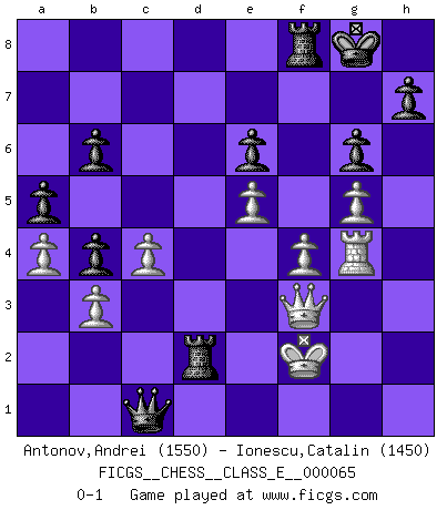 Last move : 0-1 2008 March 22 4:49:19 [Event "FICGS__CHESS__CLASS_E__000065"] [Site "FICGS"] [Date "2007.10.28"] [Round "1"] [White "Antonov,Andrei"] [Black "Ionescu,Catalin"] [Result "0-1"] [WhiteElo "1550"] [BlackElo "1450"] 1.e4 c5 2.d3 Nc6 3.c4 g6 4.Ne2 Bg7 5.a4 d6 6.b3 Bxa1 7.Na3 Nb4 8.Nc2 Bg7 9.Nxb4 cxb4 10.Bd2 a5 11.h4 Nf6 12.f3 O-O 13.g4 b6 14.g5 Nh5 15.Bh3 Bxh3 16.Rxh3 f6 17.Ng3 Nxg3 18.Rxg3 fxg5 19.hxg5 Be5 20.f4 Bd4 21.Qf3 e6 22.Ke2 d5 23.Be3 dxe4 24.dxe4 Qd6 25.Bxd4 Qxd4 26.e5 Rad8 27.Rg4 Qb2+ 28.Ke1 Qc1+ 29.Kf2 Rd2+ 0-1 Sicilian defense Kingside Castling by player Black (move 12) Player Black won this chess game. Follow this game move after move (download)It was clear to me that the vulnerable point of the American Grandmaster (Bobby Fischer) was in double-edged, hanging, irrational positions, where he often failed to find a win even in a won position. (Efim Geller) Wenn du auf das Glück wartest, wird das Leben ziemlich langweilig. (Mikhail Nekhemyevich Tal) El Ajedrez expande y enriquece tu mente. (Saudin Robovic) Aux échecs, les retours au sommet sont rares : les dommages psychologiques consécutifs à une défaite sont trop sévères. (Daily Telegraph) Chess is everything: art, science and sport. (Anatoly Karpov)