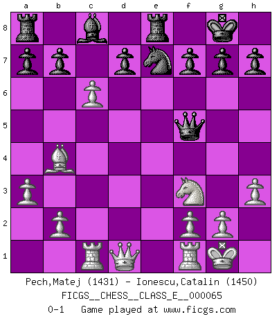 Last move : 0-1 2008 March 19 16:45:0 [Event "FICGS__CHESS__CLASS_E__000065"] [Site "FICGS"] [Date "2007.10.28"] [Round "1"] [White "Pech,Matej"] [Black "Ionescu,Catalin"] [Result "0-1"] [WhiteElo "1431"] [BlackElo "1450"] 1.e4 c5 2.c3 e6 3.Nf3 Nc6 4.d4 cxd4 5.cxd4 Bb4+ 6.Bd2 Qa5 7.Nc3 Nge7 8.d5 exd5 9.a3 Bxc3 10.Bxc3 Qc5 11.Rc1 Qd6 12.Bc4 O-O 13.exd5 Qf4 14.O-O Qxc4 15.dxc6 Qg4 16.Bb4 Re8 17.h3 Qf5 0-1 This chess game has been lost on time (started : 2007.10.28 18:11:4) Sicilian : Alapin's variation (2.c3) Kingside Castling by player Black (move 12) Kingside Castling by player White (move 14) Player Black won this chess game. Follow this game move after move (download)A chess genius has died; a loss for humanity. (Viktor Kortchnoi, about Bobby Fischer's death) Ich bin der einzige Schachspieler, der sich während der Vorbereitungen zum Turnier verletzt hat. (Woody Allen) El Ajedrez es 99 por ciento táctica. (Teichmann) La guerre est enfant de la passion, la passion est enfant du narcissisme et le narcissisme est l'enfant. (...) Une autre partie ? (Thibault de Vassal) There's no money in correspondence chess. (John Knudsen)