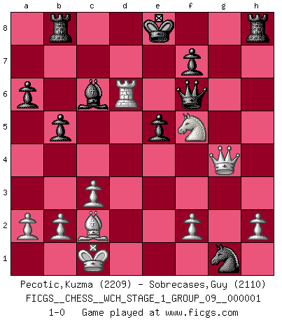 Last move : 1-0 2006 September 12 8:35:16 [Event "FICGS__CHESS__WCH_STAGE_1_GROUP_09__000001"] [Site "FICGS"] [Date "2006.07.01"] [Round "1"] [White "Pecotic,Kuzma"] [Black "Sobrecases,Guy"] [Result "1-0"] [WhiteElo "2209"] [BlackElo "2110"] 1.e4 c5 2.Nf3 e6 3.d4 cxd4 4.Nxd4 Nf6 5.Nc3 Nc6 6.Ndb5 d6 7.Bf4 e5 8.Bg5 a6 9.Na3 b5 10.Nd5 Be7 11.Bxf6 Bxf6 12.c3 Ne7 13.Nxf6+ gxf6 14.Bd3 d5 15.Nc2 Bb7 16.exd5 Nxd5 17.Be4 f5 18.Bxf5 Nf4 19.Ne3 Bxg2 20.Rg1 Bc6 21.Qg4 Qf6 22.O-O-O Rd8 23.Bxh7 Rb8 24.Bc2 Nh3 25.Nf5 Nxg1 26.Rd6 1-0 Sicilian : Anderssen variation Queenside Castling by player White (move 22) Player White won this chess game. Follow this game move after move (download)Chess is no whit inferior to the violin, and we have a large number of professional violinists. (Mikhail Botvinnik) Schach ist Leben. (Robert James Fischer) Bobby solo arroja las piezas y solas caen en las casillas correctas. (Miguel Najdorf ) Mais n'est-ce pas déjà le limiter injurieusement que d'appeler les échecs un jeu? N'est-ce pas aussi une science, un art, ou quelque chose qui, comme le cercueil de Mahomet entre ciel et terre, est suspendu entre l'un et l'autre, et qui réunit un nombre incroyable de contraires ? (Stefan Zweig) Hello Thibault, if I have had a plan (and I had one, I hope), I have forgotten it during the last week... - Hello Heinz-Georg. What do you mean a plan ? (Anonymous players, during a Big Chess game)