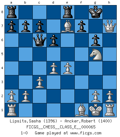 Last move : 1-0 2007 November 19 0:31:50 [Event "FICGS__CHESS__CLASS_E__000065"] [Site "FICGS"] [Date "2007.10.28"] [Round "1"] [White "Lipsits,Sasha"] [Black "Ancker,Robert"] [Result "1-0"] [WhiteElo "1396"] [BlackElo "1400"] 1.e4 e5 2.Nf3 Bc5 3.Nc3 Bxf2+ 4.Kxf2 Nf6 5.Nxe5 O-O 6.d4 d6 7.Nf3 Ng4+ 8.Kg1 Nf6 9.Bg5 Nc6 10.Nd5 Bg4 11.c3 Ne7 12.Nxf6+ Kh8 13.Nxg4 Qd7 14.Nf6 Qc6 15.Nxh7 Kxh7 16.Bxe7 Rfe8 17.Ng5+ Kg8 18.Qh5 g6 19.Qh7+ 1-0 King's knight Opening Kingside Castling by player Black (move 5) Player White won this chess game. Follow this game move after move (download)Don't even mention losing to me. I can't stand to think of it. (Bobby Fischer) Ich glaube, ich kenne inzwischen die Gründe für mein Versagen: schachliche Charakterfehler. Ich war nie ein Wunderkind und in meiner gesamten menschlichen Entwicklung immer zu langsam. (Viktor Kortschnoi) El Ajedrez es de 30 a 40 por ciento psicología. Uno no cuenta con esto cuando se juega contra una computadora. No lo puedo confundir. (Judith Polgar) Le profane ne songe pas à la somme de jouissance dont il se prive, qui méconnaît ce jeu aux ressources aussi variées que passionnantes. (Jean-Marie Jeanton-Lamarche) It is not titles that honor men, but men that honor titles. (Niccolo Machiavelli)