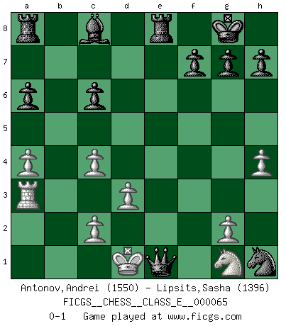 Last move : 0-1 2007 November 29 21:44:49 [Event "FICGS__CHESS__CLASS_E__000065"] [Site "FICGS"] [Date "2007.10.28"] [Round "1"] [White "Antonov,Andrei"] [Black "Lipsits,Sasha"] [Result "0-1"] [WhiteElo "1550"] [BlackElo "1396"] 1.e4 e6 2.Nc3 c5 3.f3 Nc6 4.a4 d5 5.exd5 exd5 6.Bb5 a6 7.Bxc6+ bxc6 8.b3 Nf6 9.Qe2+ Be7 10.h4 O-O 11.d3 c4 12.bxc4 Bb4 13.Bd2 Re8 14.Ne4 dxe4 15.fxe4 Bxd2+ 16.Qxd2 Nxe4 17.Qc1 Ng3 18.Kd1 Nxh1 19.Qf4 Qe7 20.Qd2 Qf6 21.Ra3 Qf1+ 22.Qe1 Qxe1+ 0-1 French defense Kingside Castling by player Black (move 10) Player Black won this chess game. Follow this game move after move (download)The game of Chess is not merely an idle amusement; several very valuable qualities of the mind are to be acquired and strengthened by it, so as to become habits ready on all occasions; for life is a kind of Chess. (Benjamin Franklin) Kasparov ist eine Art Monster mit hundert Augen, denen auch nicht das Geringste entgeht. (Tony Miles) Una de estas pequeñas movidas modestas pudieran ser mas molestas a tu oponente que la amenaza mas grande. (Siegbert Tarrasch) L'ordinateur a tué l'originalité. Il n'y a plus guère d'aventures sur l'échiquier. (Jacob Murray) I can't decide which is riskier; taking crazy risks, or taking advice on crazy risks from a crazy risk taker. (Gregory House in House M.D.)