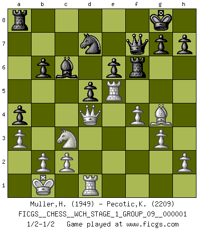 Last move : 1/2-1/2 2006 July 21 9:54:22 [Event "FICGS__CHESS__WCH_STAGE_1_GROUP_09__000001"] [Site "FICGS"] [Date "2006.07.01"] [Round "1"] [White "Muller,Henri-Louis"] [Black "Pecotic,Kuzma"] [Result "1/2-1/2"] [WhiteElo "1949"] [BlackElo "2209"] 1.e4 e6 2.d4 d5 3.Nc3 Nf6 4.Bg5 Be7 5.e5 Nfd7 6.Bxe7 Qxe7 7.f4 O-O 8.Nf3 c5 9.Qd2 Nc6 10.dxc5 Nxc5 11.O-O-O b6 12.Bd3 a5 13.Bb5 Na7 14.Be2 Bb7 15.Kb1 Nc6 16.Qe3 f6 17.Rhe1 fxe5 18.Nxe5 Nxe5 19.Qxe5 Rf5 20.Qe3 Qf7 21.g3 Rf6 22.Qe5 Bc6 23.Bg4 a4 24.a3 Qb7 25.Qd4 Qf7 26.Re5 Nd7 1/2-1/2 Comment by player 1 : Henri-Louis Muller : accept draw ! and thanks for the game ! French : Classical, Steinitz variation Kingside Castling by player Black (move 7) Queenside Castling by player White (move 11) This chess game ended in a draw. Follow this game move after move (download)Not only will I predict his triumph over Botvinnik, but I'll go further and say that he'll probably be the greatest Chess player that ever lived. (John Collins) Es genügt nicht ein guter Spieler zu sein, man muß auch gut spielen. (Siegbert Tarrasch) Si yo gano un torneo, yo lo gano por mí mismo. Yo hago las jugadas. Nadie me ayuda. (Bobby Fischer) Vous m'avez demandé de vous exposer quel est le fondement de la prière. Je ne fais que préparer les pièces du jeu sur la table... Nous sera-t-il permis d'en adopter les règles et si nous les appliquons scrupuleusement nous ne tarderons pas à faire mat le Roi divin ! Il ne pourra échapper à nos mains. (Sainte Thérèse d'Avila, Chemin de perfection) CHESS, n. f. [echecs, Fr.] A nice and abstruse game, in which two sets of puppets are moved in opposition to each other. (Dr Samuel Johnson, A Dictionary Of The English Language, 1755)