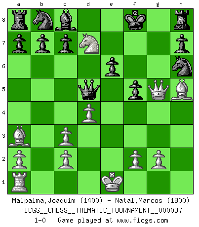 Last move : 1-0 2008 February 15 1:30:57 [Event "FICGS__CHESS__THEMATIC_TOURNAMENT__000037"] [Site "FICGS"] [Date "2007.10.30"] [Round "1"] [White "Malpalma,Joaquim"] [Black "Natal,Marcos"] [Result "1-0"] [WhiteElo "1400"] [BlackElo "1800"] 1.e4 e6 2.d4 Ne7 3.Nf3 Ng6 4.Nc3 d5 5.h4 Bb4 6.h5 Bxc3+ 7.bxc3 Ne7 8.h6 gxh6 9.Rxh6 dxe4 10.Ng5 Ng8 11.Nxe4 f5 12.Qh5+ Kf8 13.Nc5 Qd5 14.Ba3 Kg7 15.Qg5+ Kf7 16.Be2 Nxh6 17.Bh5+ Kf8 18.Nd7+ 1-0 French defense Player White won this chess game. Follow this game move after move (download)Robert Fischer is a law unto himself. (Larry Evans) Schachspieler können ausgezeichnet Varianten am Schachbrett berechnen, aber nicht im realen Leben. Zu stark ist der Individualismus im Schach ausgeprägt, und für viele ist ein kleiner momentaner persönlicher Vorteil wichtiger als ein weit größerer Vorteil von morgen. (Anatoly Karpov) ¿Que sería del Ajedrez sin errores graciosos?. (Kurt Richter) La victoire dans une partie d'Echecs appartient la plupart du temps à celui qui voit un peu plus loin que l'adversaire. (Lasker) Are you threatening me, Master Jedi ? (Chancellor Palpatine in Star Wars ep.3)