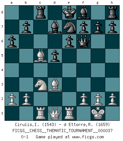 Last move : 0-1 2008 January 24 11:39:22 [Event "FICGS__CHESS__THEMATIC_TOURNAMENT__000037"] [Site "FICGS"] [Date "2007.10.30"] [Round "1"] [White "Cirulis,Ilmars"] [Black "d Ettorre,Rodolfo"] [Result "0-1"] [WhiteElo "1543"] [BlackElo "1659"] 1.e4 e6 2.d4 d5 3.e5 c5 4.Nf3 Nc6 5.c3 Qb6 6.Bd3 cxd4 7.cxd4 Bd7 8.O-O Nxd4 9.Nxd4 Qxd4 10.Nc3 a6 11.Re1 Ne7 12.Be3 Qxe5 13.Rc1 Rc8 14.Bc5 Qf6 0-1 This chess game has been lost on time (started : 2007.10.30 9:23:27) French : Advance, Nimzovich system Kingside Castling by player White (move 8) Player Black won this chess game. Follow this game move after move (download)Chess holds its master in its own bonds, shackling the mind and brain so that the inner freedom of the very strongest must suffer. (Albert Einstein) Die größte Kunst beim Schach besteht darin dem Gegner nicht zu zeigen was er tun kann. (Garry Kasparov) Nada excita más a Grandes Maestros aburridos que una novedad teórica. (Dominic Lawson) Le jeu d'échecs est comme rejeté hors du temps. (Antoine de Saint-Exupéry) Opportunities multiply as they are seized. (Sun Tzu)