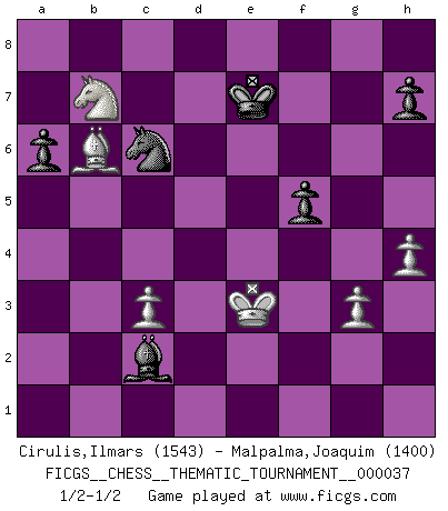 Last move : 1/2-1/2 2008 January 30 18:31:18 [Event "FICGS__CHESS__THEMATIC_TOURNAMENT__000037"] [Site "FICGS"] [Date "2007.10.30"] [Round "1"] [White "Cirulis,Ilmars"] [Black "Malpalma,Joaquim"] [Result "1/2-1/2"] [WhiteElo "1543"] [BlackElo "1400"] 1.e4 e6 2.d4 d5 3.e5 c5 4.Nf3 cxd4 5.Nxd4 Nd7 6.Bb5 Qb6 7.Nc3 a6 8.Bxd7+ Bxd7 9.O-O Ne7 10.Rb1 Ng6 11.f4 Bc5 12.Be3 Qc7 13.Qe2 O-O 14.Rbd1 Qb6 15.Rd3 Rac8 16.g3 Qd8 17.Nf3 Be7 18.h4 Bb4 19.f5 Nh8 20.f6 gxf6 21.exf6 Qxf6 22.Bd4 Qe7 23.Ne5 f5 24.Re3 Bxc3 25.bxc3 Bb5 26.Nd3 Rc6 27.Re1 Nf7 28.Rxe6 Qxe6 29.Qxe6 Rxe6 30.Rxe6 Nd8 31.Rd6 Nc6 32.Rxd5 Bc4 33.Rd7 Rf7 34.Rxf7 Kxf7 35.Nc1 Bd5 36.Nb3 Be4 37.Nc5 Bd5 38.Kf2 Bxa2 39.Nxb7 Bb1 40.Ke3 Bxc2 41.Bb6 Ke7 1/2-1/2 French : Advance, Nimzovich system Kingside Castling by player White (move 9) Kingside Castling by player Black (move 13) This chess game ended in a draw. Follow this game move after move (download)Whoever sees no other aim in the game than that of giving checkmate to one's opponent will never become a good Chess player. (Euwe) Ich liebe den Moment, wenn ich das Ego meines Gegenüber breche. (Robert James Fischer) Fischer sacrificó virtualmente todo lo que la mayoría de nosotros los 'debiles' (término que él usa) valoramos, respetamos y apreciamos por el amor de un astuto, a menudo hermoso tablero de juego, por el privilegio ambivalente de ser su mas grande maestro. (Paul Kollar) Vous m'avez demandé de vous exposer quel est le fondement de la prière. Je ne fais que préparer les pièces du jeu sur la table... Nous sera-t-il permis d'en adopter les règles et si nous les appliquons scrupuleusement nous ne tarderons pas à faire mat le Roi divin ! Il ne pourra échapper à nos mains. (Sainte Thérèse d'Avila, Chemin de perfection) Always remember that you are unique; just like everyone else. (Unknown)