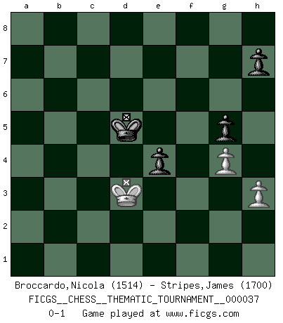 Last move : 0-1 2008 June 26 15:24:22 [Event "FICGS__CHESS__THEMATIC_TOURNAMENT__000037"] [Site "FICGS"] [Date "2007.10.30"] [Round "1"] [White "Broccardo,Nicola"] [Black "Stripes,James"] [Result "0-1"] [WhiteElo "1514"] [BlackElo "1700"] 1.e4 e6 2.c4 d5 3.cxd5 exd5 4.e5 Ne7 5.d4 c5 6.Bb5+ Nbc6 7.Nf3 a6 8.Be2 cxd4 9.O-O Qb6 10.Nbd2 Ng6 11.Nb3 Ngxe5 12.Nxe5 Nxe5 13.Nxd4 Bd6 14.Re1 O-O 15.Nc2 Be6 16.Nd4 Bc5 17.Be3 Rfe8 18.b3 Nc6 19.Nxc6 Bxe3 20.fxe3 Qxe3+ 21.Kh1 bxc6 22.Bxa6 Qf2 23.Be2 Bf5 24.Bf3 Rxe1+ 25.Qxe1 Qb2 26.b4 Kf8 27.h3 Bc2 28.a3 Rxa3 29.Rxa3 Qxa3 30.b5 cxb5 31.Bxd5 Qe7 32.Qa5 Ba4 33.Bc6 f6 34.Bxb5 Bxb5 35.Qxb5 Qe1+ 36.Kh2 Qe5+ 37.Qxe5 fxe5 38.g4 Kf7 39.Kg2 Ke6 40.Kf2 Kd5 41.Ke3 g5 42.Kd3 e4+ 0-1 French defense, Steiner variation Kingside Castling by player White (move 9) Kingside Castling by player Black (move 14) 10 pieces endgame at move 34 : White KQPP , Black KQBPPP WHITE : King + 1 Queen 2 Pawns BLACK : King + 1 Queen 1 Bishop 3 Pawns 9 pieces endgame at move 35 : White KQPP , Black KQPPP WHITE : King + 1 Queen 2 Pawns BLACK : King + 1 Queen 3 Pawns 8 pieces endgame at move 37 : White KQPP , Black KPPP WHITE : King + 1 Queen 2 Pawns BLACK : King + 3 Pawns 7 pieces endgame at move 37 : White KPP , Black KPPP WHITE : King + 2 Pawns BLACK : King + 3 Pawns Player Black won this chess game. Follow this game move after move (download)I'm not a materialistic person, in that, I don't suffer the lack or loss of money. The absence of worldly goods I don't look back on. For Chess is a way I can be as materialistic as I want without having to sell my soul. (Jamie Walter Adams) Schach ist mein Leben, meine Leidenschaft, was ich gelernt habe und seit meinem 14. Lebensjahr profimässig praktiziere. Darauf zu verzichten, würde mir sehr schwer fallen. (Viktor Kortschnoi) El juego de Damas es para vagabundos. (Paul Morphy) Des points faibles ou des trous dans la position de l'adversaire doivent être occupés par des pièces et non pas par des pions. (Siegbert Tarrasch) Memory is a way of holding onto the things you love, the things you are, the things you never want to lose. (from the television show: The Wonder Years)