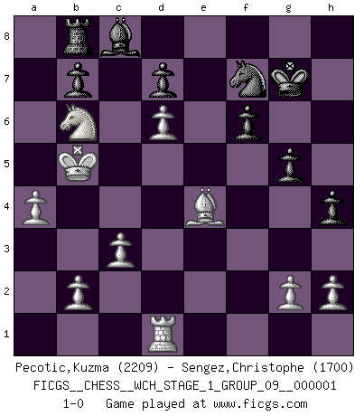 Last move : 1-0 2006 August 18 18:47:16 [Event "FICGS__CHESS__WCH_STAGE_1_GROUP_09__000001"] [Site "FICGS"] [Date "2006.07.01"] [Round "1"] [White "Pecotic,Kuzma"] [Black "Sengez,Christophe"] [Result "1-0"] [WhiteElo "2209"] [BlackElo "1700"] 1.e4 c5 2.Nf3 Nf6 3.e5 Nd5 4.Nc3 e6 5.Nxd5 exd5 6.d4 Nc6 7.dxc5 Bxc5 8.c3 O-O 9.Qxd5 Qb6 10.Bd3 Bxf2+ 11.Kf1 g6 12.a4 a5 13.Bh6 Re8 14.Bc4 Nd8 15.Ng5 Re7 16.Ne4 Be3 17.Nf6+ Kh8 18.Qd6 Qxd6 19.exd6 Re5 20.Bxe3 Rxe3 21.Nd5 Re6 22.Nb6 Rf6+ 23.Ke2 Rb8 24.Rad1 Kg7 25.Rhf1 Rxf1 26.Rxf1 f6 27.Kd3 Nc6 28.Bd5 Ne5+ 29.Kd4 g5 30.Kc5 Kg6 31.Be4+ Kg7 32.Kb5 Nf7 33.Rd1 h5 34.Kxa5 h4 35.Kb5 1-0 Sicilian : Nimzovich-Rubinstein; Rubinstein counter-gambit Kingside Castling by player Black (move 8) Player White won this chess game. Follow this game move after move (download)I love all positions. Give me a difficult positional game, I will play it. But totally won positions, I cannot stand them. (Hein Donner) Wenn du auf das Glück wartest, wird das Leben ziemlich langweilig. (Mikhail Nekhemyevich Tal) De eso se trata el Ajedrez. Un día le das una lección a tu oponente y al día siguiente el te da una a tí. (Bobby Fischer) Aux échecs, les retours au sommet sont rares : les dommages psychologiques consécutifs à une défaite sont trop sévères. (Daily Telegraph) Life is like a game of cards: the hand you are dealt represents determinism; the way you play it is free will. (Jawaharlal Nehru)
