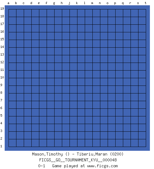 Last move : 0-1 2007 November 30 19:59:16 [Event "FICGS__GO__TOURNAMENT_KYU__000048"] [Site "FICGS"] [Date "2007.10.31"] [Round "1"] [Black "Mason,Timothy"] [White "Tiberiu,Maran"] [Result "0-1"] [Rating 2 "0200"] 0-1 This go game has been lost on time (started : 2007.10.31 9:23:1) Here are the names of the openings (joseki) played in the four corners : Player White won this Go (weiqi, baduk) game. Follow this game move after move (download)Fighting must not be the key to go, it should be reserved as your last resource. (Zhong-Pu Liu, about Weiqi) The best teachers teach from the heart, not from the book. (Author unknown)