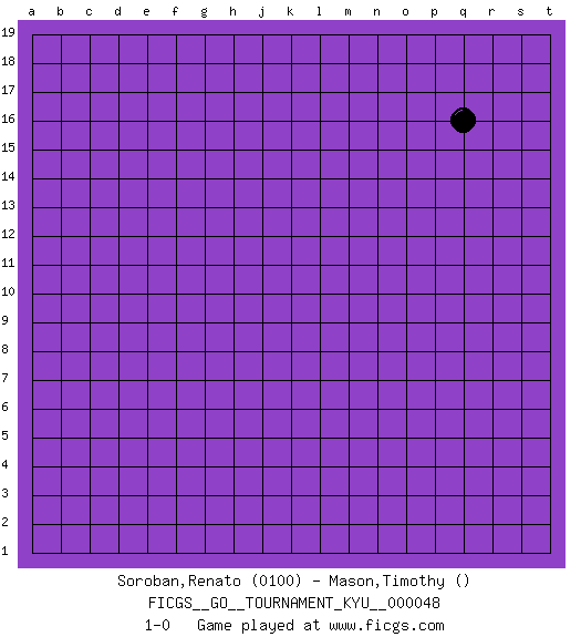 Last move : 1-0 2007 November 30 19:59:16 [Event "FICGS__GO__TOURNAMENT_KYU__000048"] [Site "FICGS"] [Date "2007.10.31"] [Round "1"] [Black "Soroban,Renato"] [White "Mason,Timothy"] [Result "1-0"] [Rating 1 "0100"] 1.q16 1-0 This go game has been lost on time (started : 2007.10.31 9:23:1) Here are the names of the openings (joseki) played in the four corners : Player Black won this Go (weiqi, baduk) game. Follow this game move after move (download)The nature of a game comes from what is played, but it's the sensitivity to the possible and the impossible that gives it value. (Pierre Audouard) Once you start thinking you have nothing left to learn, you have everything to learn. (Steve Badget)