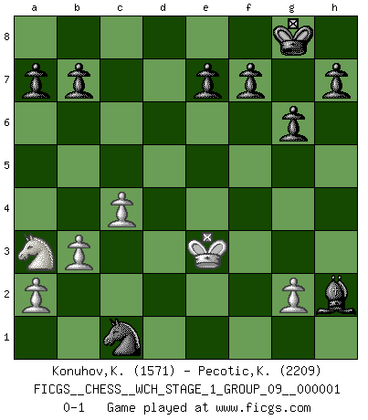 Last move : 0-1 2006 August 9 11:23:34 [Event "FICGS__CHESS__WCH_STAGE_1_GROUP_09__000001"] [Site "FICGS"] [Date "2006.07.01"] [Round "1"] [White "Konuhov,Konstantin"] [Black "Pecotic,Kuzma"] [Result "0-1"] [WhiteElo "1571"] [BlackElo "2209"] 1.e4 c5 2.f4 g6 3.Nf3 Bg7 4.Be2 Nc6 5.c3 Nf6 6.e5 Nd5 7.d4 cxd4 8.Nxd4 d6 9.Bb5 Bd7 10.Na3 dxe5 11.fxe5 Nxe5 12.Bxd7 Qxd7 13.O-O O-O 14.c4 Nb4 15.Nf3 Qxd1 16.Rxd1 Rfd8 17.Rxd8+ Rxd8 18.Nxe5 Rd1+ 19.Kf2 Bxe5 20.Rb1 Rxc1 21.Rxc1 Nd3+ 22.Ke3 Nxc1 23.b3 Bxh2 0-1 Sicilian : Grand Prix attack Kingside Castling by player White (move 13) Kingside Castling by player Black (move 13) Player Black won this chess game. Follow this game move after move (download)Capture of the adverse King is the ultimate but not the first object of the game. (William Steinitz) Jede Eröffnung ist gut genug um gespielt zu werden, wenn nur ihr Ruf schlecht genug ist. (Savielly Grigorievitsch Tartakower) Del Ajedrez se ha dicho que la vida no es lo suficientemente larga para él, pero eso es culpa de la vida, no del Ajedrez. (William Ewart Napier) RxDa4 pat (...) A woman without a man is like a fish without a bicycle. (Gloria Steinem)