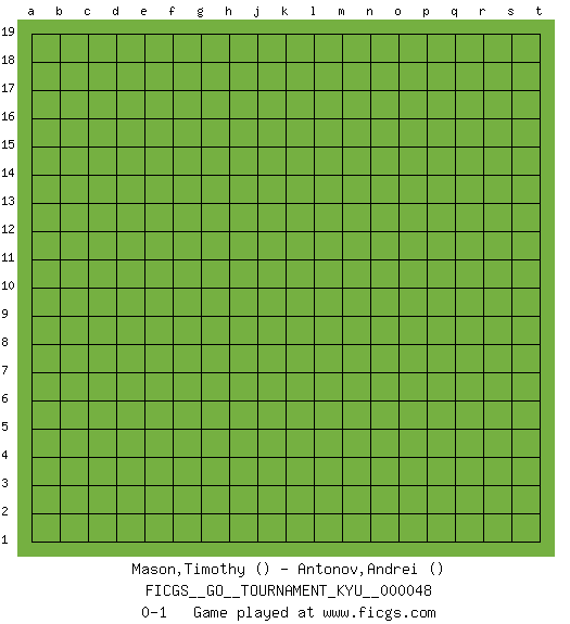 Last move : 0-1 2007 November 30 19:59:16 [Event "FICGS__GO__TOURNAMENT_KYU__000048"] [Site "FICGS"] [Date "2007.10.31"] [Round "1"] [Black "Mason,Timothy"] [White "Antonov,Andrei"] [Result "0-1"] 0-1 This go game has been lost on time (started : 2007.10.31 9:23:1) Here are the names of the openings (joseki) played in the four corners : Player White won this Go (weiqi, baduk) game. Follow this game move after move (download)For rectangular six in the corner, dame is necessary. (Anonymous) There will be no order, only chaos. (Sol Robeson in Pi by Darren Aronofsky)