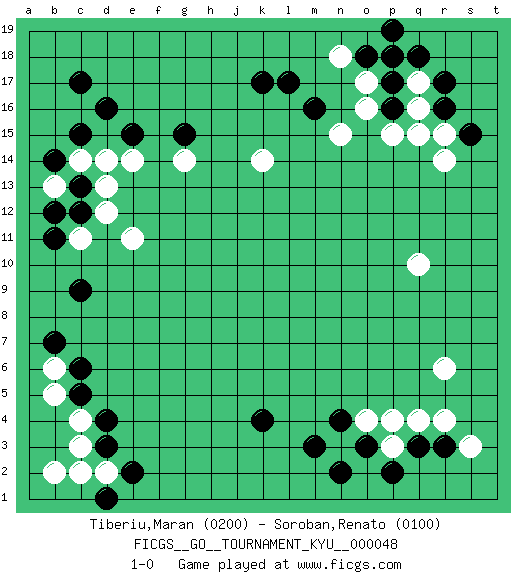Last move : 1-0 2007 December 22 12:20:43 [Event "FICGS__GO__TOURNAMENT_KYU__000048"] [Site "FICGS"] [Date "2007.10.31"] [Round "1"] [Black "Tiberiu,Maran"] [White "Soroban,Renato"] [Result "1-0"] [Rating 1 "0200"] [Rating 2 "0100"] 1.d16 q4 2.d4 q16 3.k4 n3 4.m3 q10 5.r17 q17 6.r16 r15 7.s15 r14 8.q18 p18 9.p17 o17 10.p16 q15 11.o18 c14 12.c15 r6 13.r3 r4 14.q3 p3 15.p2 s3 16.o3 p4 17.n4 o4 18.n2 n18 19.p19 c11 20.c9 e11 21.c17 e14 22.e15 g14 23.g15 o16 24.k17 k14 25.m16 p15 26.p18 n15 27.l17 c3 28.d3 c4 29.c5 b5 30.c6 b6 31.b7 d2 32.e2 b2 33.d1 c2 34.b14 b13 35.c13 d14 36.b12 d13 37.c12 d12 38.b11 1-0 Here are the names of the openings (joseki) played in the four corners : Corner q16 : q16 r17 Hoshi (Hwajeom, Seongjeom, Xingwei`) 4-4 Point. The star or hoshi (4-4) point, emphasizing influence at the potential expense of territory. Corner d16 : d16 c14 Hoshi (Hwajeom, Seongjeom, Xingwei`) 4-4 Point. The star or hoshi (4-4) point, emphasizing influence at the potential expense of territory. Ikken Kakari (Hankan Keolch'im, Yi Gua`jiao~, 1-Space Low Approach). White 2 is the standard approach move to the 4-4. Player Black won this Go (weiqi, baduk) game. Follow this game move after move (download)Don't disturb symmetry. (Anonymous) The real danger is not that computers will begin to think like men, but that men will begin to think like computers. (Sydney J. Harris)