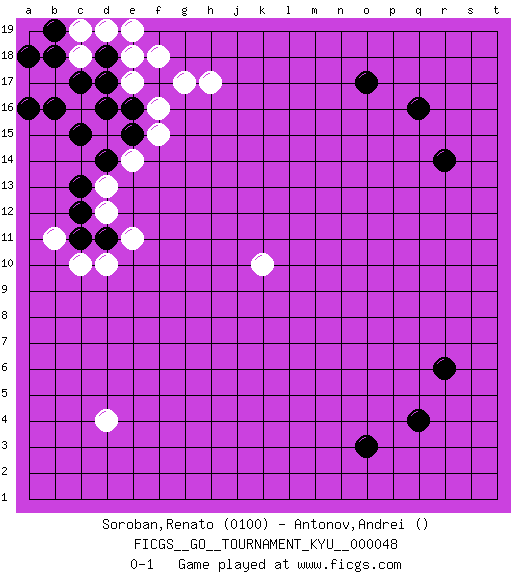 Last move : 0-1 2007 December 22 12:21:1 [Event "FICGS__GO__TOURNAMENT_KYU__000048"] [Site "FICGS"] [Date "2007.10.31"] [Round "1"] [Black "Soroban,Renato"] [White "Antonov,Andrei"] [Result "0-1"] [Rating 1 "0100"] 1.q16 k10 2.q4 d4 3.d16 d15 4.e15 f15 5.d14 e14 6.e16 f16 7.f17 c16 8.c15 d13 9.c13 d12 10.c12 d10 11.o17 h17 12.r14 b11 13.c11 c10 14.d11 e11 15.o3 e18 16.c17 c18 17.d18 b17 18.b16 e17 19.d17 f18 20.b18 a17 21.a18 c19 22.a16 d19 23.b19 e19 24.r6 g17 0-1 Here are the names of the openings (joseki) played in the four corners : Corner d16 : d16 d15 Hoshi (Hwajeom, Seongjeom, Xingwei`) 4-4 Point. The star or hoshi (4-4) point, emphasizing influence at the potential expense of territory. Corner d4 : d4 0-1 Hoshi (Hwajeom, Seongjeom, Xingwei`) 4-4 Point. The star or hoshi (4-4) point, emphasizing influence at the potential expense of territory. Player White won this Go (weiqi, baduk) game. Follow this game move after move (download)The carpenter's square becomes ko. (Anonymous) Life is pain my dear and anyone who says otherwise is selling something. (Princess Bride)