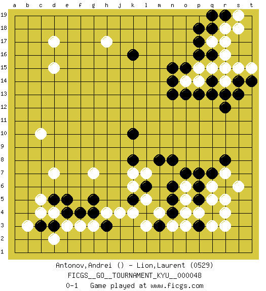 Last move : 0-1 2008 February 2 0:21:20 [Event "FICGS__GO__TOURNAMENT_KYU__000048"] [Site "FICGS"] [Date "2007.10.31"] [Round "1"] [Black "Antonov,Andrei"] [White "Lion,Laurent"] [Result "0-1"] [Rating 2 "0529"] 1.n13 d4 2.q4 d17 3.k16 r16 4.q16 r17 5.p18 d15 6.r15 q17 7.p17 q15 8.p16 r14 9.q18 r18 10.r19 s15 11.r12 o3 12.q14 s19 13.q19 s18 14.q13 p15 15.o15 p14 16.o13 o14 17.n15 k4 18.p13 c10 19.s13 f3 20.s14 t15 21.t14 c5 22.r13 r15 23.n14 r3 24.p5 q3 25.n4 o4 26.n6 o5 27.p7 o6 28.n8 k7 29.k10 r4 30.o7 q5 31.p6 q6 32.q7 r7 33.r6 r5 34.r8 s6 35.n5 n3 36.l4 l3 37.k5 l5 38.h3 j4 39.g5 h4 40.g4 g3 41.m3 m4 42.l6 k6 43.k8 l7 44.m8 g7 45.e4 e3 46.d5 c4 47.e5 d7 48.f4 h17 49.p3 p4 50.d3 d2 51.c3 b3 0-1 This go game has been lost on time (started : 2007.10.31 9:23:1) Here are the names of the openings (joseki) played in the four corners : Corner q16 : n13 r16 This joseki is unknown. A weak or weird move has probably been played in this corner. Corner q4 : q4 o3 Hoshi (Hwajeom, Seongjeom, Xingwei`) 4-4 Point. The star or hoshi (4-4) point, emphasizing influence at the potential expense of territory. Ikken Kakari (Hankan Keolch'im, Yi Gua`jiao~, 1-Space Low Approach). White 2 is the standard approach move to the 4-4. Player White won this Go (weiqi, baduk) game. Follow this game move after move (download)Win the early ko to win the game. (Anonymous) To steal ideas from one person is plagiarism. To steal from many is research. (Unknown)
