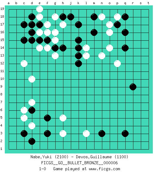 Last move : 1-0 2007 November 2 16:30:18 [Event "FICGS__GO__BULLET_BRONZE__000006 "] [Site "FICGS"] [Date "2007.11.02"] [Round "1"] [Black "Nabe,Yuki "] [White "Devos,Guillaume "] [Result "1-0"] [Rating 1 "2100"] [Rating 2 "1100"] 1.q16 d4 2.q3 d17 3.r9 d10 4.f3 h3 5.f5 l3 6.n3 h5 7.d6 c5 8.d2 c6 9.c3 d7 10.c15 c12 11.d16 e16 12.c17 f17 13.d18 e18 14.e17 g18 15.d17 g16 16.k17 o17 17.p17 o16 18.q14 o14 19.k15 n13 20.m18 p18 21.q18 n18 22.m16 f14 23.k12 l13 24.k13 l14 25.k14 p12 26.e15 f16 27.f15 g15 28.g14 e14 29.d15 g13 30.h14 h17 31.j18 e19 32.h18 1-0 Here are the names of the openings (joseki) played in the four corners : Corner d4 : d4 f3Hoshi (Hwajeom, Seongjeom, Xingwei`) 4-4 Point. The star or hoshi (4-4) point, emphasizing influence at the potential expense of territory.Ikken Kakari (Hankan Keolch'im, Yi Gua`jiao~, 1-Space Low Approach). Black 2 is the standard approach move to the 4-4. Corner d16 : d17 c15Komoku (Somok, Xiao~mu`) 3-4 Point. The komoku (3-4) point is the traditional corner enclosure move..Ikken Kakari (Hankan Keolch'im, Yi Gua`jiao~, 1-Space Low Pincer). The small knight move is the basic approach move to the 3-4 point stone. It has been continually used for over four centuries. There are limitless variations, with new moves constantly being discovered. Black 2 opens the door to a treaure store of joseki. Corner q16 : q16 o17Hoshi (Hwajeom, Seongjeom, Xingwei`) 4-4 Point. The star or hoshi (4-4) point, emphasizing influence at the potential expense of territory.Ikken Kakari (Hankan Keolch'im, Yi Gua`jiao~, 1-Space Low Approach). White 2 is the standard approach move to the 4-4. Player Black won this Go (weiqi, baduk) game.Follow this game move after move (download ) Beware of the clumsy double contact. (Anonymous) Life is painting a picture, not doing a sum. (Oliver Wendell Holmes, Jr.)