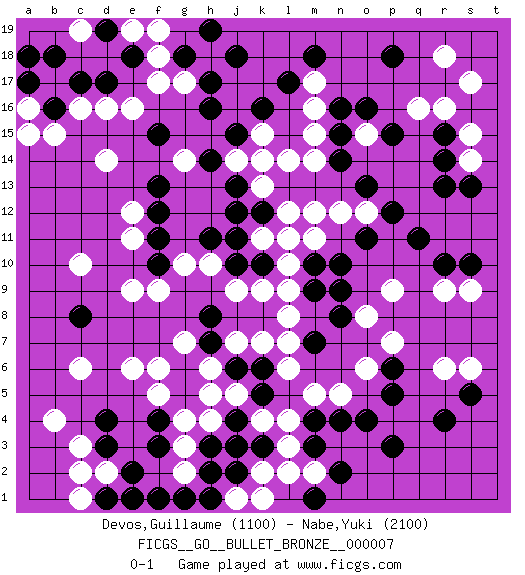 Last move : 0-1 2007 November 2 17:39:40 [Event "FICGS__GO__BULLET_BRONZE__000007"] [Site "FICGS"] [Date "2007.11.02"] [Round "1"] [Black "Devos,Guillaume"] [White "Nabe,Yuki"] [Result "0-1"] [Rating 1 "1100"] [Rating 2 "2100"] 1.d4 q16 2.r4 d16 3.p3 c6 4.c8 e6 5.f4 b4 6.j4 c3 7.d3 c10 8.k16 g17 9.q11 m16 10.r14 s15 11.o16 o15 12.n16 m15 13.n15 m14 14.n14 r9 15.p15 r6 16.r15 r16 17.p18 s14 18.r13 r18 19.k14 m12 20.l17 m17 21.h17 h18 22.h16 k13 23.j18 j14 24.g18 f18 25.h19 f17 26.j15 l14 27.h14 k15 28.f15 d14 29.f13 e9 30.j13 k14 31.j12 l10 32.m4 l3 33.k3 l4 34.m3 m2 35.n2 k2 36.j2 j1 37.h1 k1 38.h3 k4 39.j3 m5 40.n4 n5 41.o4 l6 42.p6 p7 43.o11 p9 44.n10 l8 45.n8 o6 46.p5 o8 47.n9 o12 48.o13 n12 49.p12 e12 50.f12 e11 51.f11 d2 52.e2 c2 53.g6 g7 54.d1 h6 55.g5 h10 56.h11 g10 57.j10 j9 58.s5 s6 59.r10 s9 60.s10 c1 61.e1 g2 62.h2 h5 63.f3 j5 64.s13 s17 65.m18 g3 66.g1 h4 67.f1 g4 68.k5 f6 69.m1 l2 70.k6 k7 71.h7 f5 72.m7 l7 73.f10 f9 74.c17 c16 75.d17 e16 76.b16 b15 77.e18 f19 78.b18 e19 79.d19 a16 80.a17 b17 81.a18 c19 82.b16 a15 83.j6 j7 84.k10 k9 85.l11 k11 86.k12 m11 87.m10 l12 88.j11 l11 89.m9 l9 90.h8 g14 0-1 Here are the names of the openings (joseki) played in the four corners : Corner d4 : d4 c6 Hoshi (Hwajeom, Seongjeom, Xingwei`) 4-4 Point. The star or hoshi (4-4) point, emphasizing influence at the potential expense of territory. Ikken Kakari (Hankan Keolch'im, Yi Gua`jiao~, 1-Space Low Approach). White 2 is the standard approach move to the 4-4. Corner q16 : q16 q11 Hoshi (Hwajeom, Seongjeom, Xingwei`) 4-4 Point. The star or hoshi (4-4) point, emphasizing influence at the potential expense of territory. Player White won this Go (weiqi, baduk) game. Follow this game move after move (download)Five liberties for tactical stability. (Anonymous) A married woman is like a fish riding a bicycle. (Rodolfo d'Ettorre)