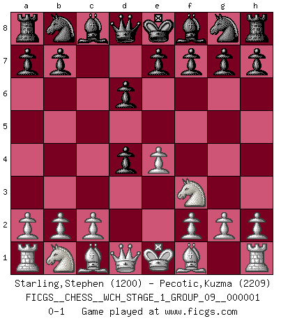 Last move : 0-1 2006 August 4 3:36:2 [Event "FICGS__CHESS__WCH_STAGE_1_GROUP_09__000001"] [Site "FICGS"] [Date "2006.07.01"] [Round "1"] [White "Starling,Stephen"] [Black "Pecotic,Kuzma"] [Result "0-1"] [WhiteElo "1200"] [BlackElo "2209"] 1.e4 c5 2.Nf3 d6 3.d4 cxd4 0-1 This chess game has been lost on time (started : 2006.07.01 16:11:36) Sicilian Player Black won this chess game. Follow this game move after move (download)Bobby is the most misunderstood, misquoted celebrity walking the face of this earth. (Yasser Seirawan) Ich weiss nicht was Gott gegen mich auf 1.e4 antworten würde. (Robert James Fischer) Puntos débiles o agujeros en la posición de tu oponente deben de ser ocupados por piezas, no Peones. (Siegbert Tarrasch) La vie et les Echecs sont tous les deux une lutte constante. (Lasker) Looking at the proliferation of personal web pages on the Net, it looks like very soon everyone on Earth will have 15 megabytes of fame. (M.G. Sriram)