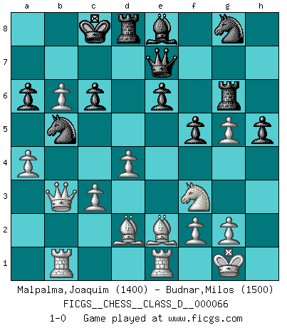 Last move : 1-0 2007 November 21 10:3:19 [Event "FICGS__CHESS__CLASS_D__000066"] [Site "FICGS"] [Date "2007.11.02"] [Round "1"] [White "Malpalma,Joaquim"] [Black "Budnar,Milos"] [Result "1-0"] [WhiteElo "1400"] [BlackElo "1500"] 1.d4 d5 2.c4 e6 3.e3 a6 4.Nf3 f6 5.Be2 Nc6 6.O-O g5 7.Nc3 Bb4 8.Bd2 h5 9.Qc2 Rh6 10.e4 dxe4 11.Qxe4 Qe7 12.Rfe1 Bd7 13.h4 O-O-O 14.hxg5 f5 15.Qc2 Rg6 16.a3 Bxc3 17.bxc3 Be8 18.c5 Na7 19.Rab1 c6 20.Qb3 b5 21.cxb6 Nb5 22.a4 1-0 Queen's gambit declined Kingside Castling by player White (move 6) Queenside Castling by player Black (move 13) Player White won this chess game. Follow this game move after move (download)Openings teach you openings. Endgames teach you chess ! (Stephan Gerzadowicz) Es ist besser die Steine des Gegners zu opfern. (Savielly Grigorievitsch Tartakower) Aún el Rey más flojo huye despavorido ante la amenaza de un Jaque doble. (Aaron Nimzowitsch) Shah mat. Le roi est mort. Cri de fierté d'un joueur venant de terrasser son adversaire, courtoisement, sans effusion de sang. The Internet isn't free. It just has an economy that makes no sense to capitalism. (Brad Shapcott)
