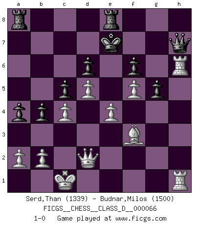 Last move : 1-0 2007 December 11 13:44:52 [Event "FICGS__CHESS__CLASS_D__000066"] [Site "FICGS"] [Date "2007.11.02"] [Round "1"] [White "Serd,Than"] [Black "Budnar,Milos"] [Result "1-0"] [WhiteElo "1339"] [BlackElo "1500"] 1.e4 g6 2.d4 Bg7 3.f3 e5 4.d5 Nf6 5.c4 O-O 6.Nc3 d6 7.Be3 a6 8.Qd2 Nh5 9.Nge2 Qh4+ 10.g3 Qf6 11.Bg2 c6 12.O-O-O c5 13.Bh6 Bd7 14.Bxg7 Qxg7 15.g4 Nf6 16.h4 b5 17.h5 g5 18.Ng3 b4 19.Nce2 a5 20.Nf5 Bxf5 21.gxf5 h6 22.Rdg1 Re8 23.f4 exf4 24.Nxf4 Nbd7 25.Nh3 a4 26.Bf3 Nh7 27.Rg3 f6 28.Nf4 Ndf8 29.Ng6 Nxg6 30.hxg6 Kf8 31.gxh7 Qxh7 32.Rgh3 Ke7 33.Rxh6 1-0 Robatsch (Modern) defense Kingside Castling by player Black (move 5) Queenside Castling by player White (move 12) Player White won this chess game. Follow this game move after move (download)I look one move ahead... the best ! (Siegbert Tarrasch) Lisa Lane, amerikanische Schachmeisterin, hatte Fischer einmal als stärksten lebenden Spieler bezeichnet. Antwort: Das ist richtig, aber Lisa Lane ist eigentlich nicht in der Lage, das zu beurteilen. (Robert James Fischer) El Rey es una pieza de pelea. ¡Usenlo!. (Wilhelm Steinitz) On est toujours la mazette de quelqu'un d'autre. (Anonyme) There's always a bigger fish. (Qui-Gon Jinn in Star Wars ep.1)