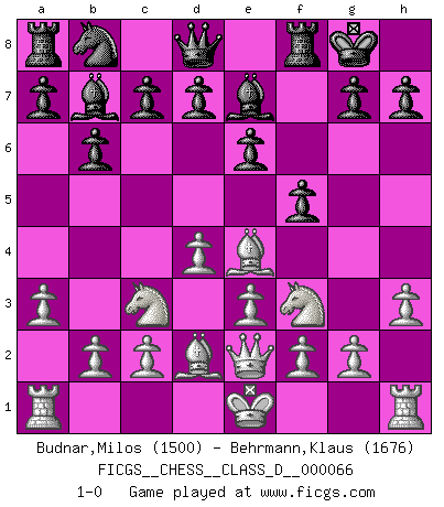 Last move : 1-0 2007 December 24 9:47:39 [Event "FICGS__CHESS__CLASS_D__000066"] [Site "FICGS"] [Date "2007.11.02"] [Round "1"] [White "Budnar,Milos"] [Black "Behrmann,Klaus"] [Result "1-0"] [WhiteElo "1500"] [BlackElo "1676"] 1.d4 f5 2.Nf3 Nf6 3.Nc3 e6 4.e3 Bb4 5.Bd2 O-O 6.Bd3 b6 7.a3 Be7 8.h3 Bb7 9.Qe2 Ne4 10.Bxe4 1-0 This chess game has been lost on time (started : 2007.11.02 20:34:6) Dutch Kingside Castling by player Black (move 5) Player White won this chess game. Follow this game move after move (download)The beauty of a move lies not in its' appearance but in the thought behind it. (Siegbert Tarrasch) Ich spiele 70 Eröffnungssysteme. (Viktor Kortschnoi) El Ajedrez demanda una total concentración. (Bobby Fischer) Tout change constamment, y compris dans le monde des Echecs. (Botvinnik) The ultimate in disposing one's troops is to be without ascertainable shape. Then the most penetrating spies cannot pry in nor can the wise lay plans against you. (Sun Tzu)