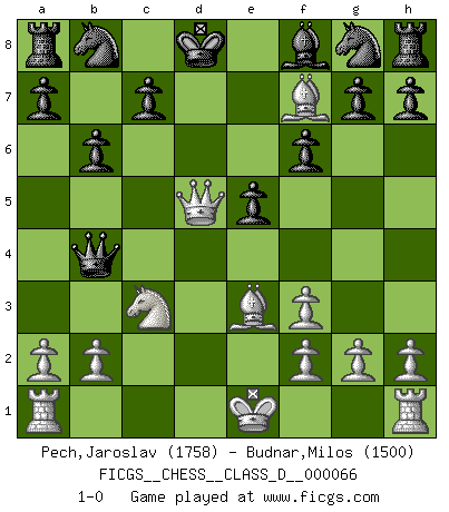 Last move : 1-0 2008 January 13 8:20:21 [Event "FICGS__CHESS__CLASS_D__000066"] [Site "FICGS"] [Date "2007.11.02"] [Round "1"] [White "Pech,Jaroslav"] [Black "Budnar,Milos"] [Result "1-0"] [WhiteElo "1758"] [BlackElo "1500"] 1.d4 d5 2.c4 Be6 3.Nf3 f6 4.cxd5 Bxd5 5.Nc3 Bxf3 6.exf3 e5 7.Qb3 b6 8.Bc4 Qxd4 9.Bf7+ Kd8 10.Be3 Qb4 11.Qd5+ 1-0 Queen's Gambit Player White won this chess game. Follow this game move after move (download)All Chess players should have a hobby. (Savielly Tartakower) Im Schach nämlich geht es darum, daß Ich des Gegners klein zu kriegen, sein Ego zu zerbrechen und zu zermahlen, seine Selbstachtung zu zertreten und zu verscharren und seine ganze mißachtenswerte sogenannte Persönlichkeit ein für alle Mal tot zu hacken und zu zerstampfen und dadurch die menschliche Gesellschaft von einer stinkenden Pestbeule zu befreien. Es ist ein königliches Spiel. (Robert James Fischer) El Ajedrez es tan interesante por sí solo, que no es necesario un interés monetario para persuadir a una persona a que lo practique; por lo tanto, nunca se juega por dinero. (Benjamin Franklin) Votre seul travail dans les ouvertures est d'obtenir un milieu de partie jouable. (Lajos Portish) The absolute truth is the thing that makes people laugh. (Carl Reiner)