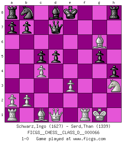 Last move : 1-0 2008 February 14 14:26:0 [Event "FICGS__CHESS__CLASS_D__000066"] [Site "FICGS"] [Date "2007.11.02"] [Round "1"] [White "Schwarz,Ingo"] [Black "Serd,Than"] [Result "1-0"] [WhiteElo "1627"] [BlackElo "1339"] 1.g3 c6 2.Bg2 d5 3.f3 e5 4.Nh3 h5 5.Nf2 h4 6.g4 Nf6 7.h3 Bc5 8.O-O e4 9.fxe4 Bxg4 10.d4 Bxh3 11.Nxh3 Bb6 12.e5 Ne4 13.Nc3 Qd7 14.Nxe4 dxe4 15.e3 Bd8 16.c4 g5 17.d5 c5 18.e6 fxe6 19.Bxe4 exd5 20.Bg6+ 1-0 Benko's Opening Kingside Castling by player White (move 8) Player White won this chess game. Follow this game move after move (download)Some part of a mistake is always correct. (Savielly Tartakover) Schach sollte überall auf der Welt Schulfach werden. Es fördert die geistige Auseinandersetzung. Es lehrt die Demut in der Niederlage. (Garry Kasparov) El Ajedrez es parte de la cultura, y si una cultura esta en decadencia, entonces también el Ajedrez declinará. (Mikhail Botvinnik) Un journaliste : 'Vous préférez avoir une dame de plus sur l'échiquier ou au lit ?' Boris Spassky : 'Ca dépend de la position.' If only people were all showed a certain minimum level of niceness; if only people didn't retract verbal draw offers (without draw box ticked) on ficgs; if only people didn't kill; if only people didn't run concentration / extermination camps, if only people didn't drop nuclear bombs on Hiroshima and Nagasaki, and so on - it would be a much more beautiful world. But sadly, things are not so... (Normajean Yates)