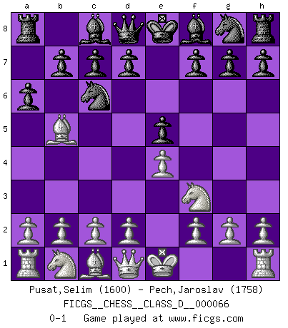 Last move : 0-1 2008 January 14 11:12:25 [Event "FICGS__CHESS__CLASS_D__000066"] [Site "FICGS"] [Date "2007.11.02"] [Round "1"] [White "Pusat,Selim"] [Black "Pech,Jaroslav"] [Result "0-1"] [WhiteElo "1600"] [BlackElo "1758"] 1.e4 e5 2.Nf3 Nc6 3.Bb5 a6 0-1 This chess game has been lost on time (started : 2007.11.02 20:34:6) Ruy Lopez (Spanish Opening) Player Black won this chess game. Follow this game move after move (download)The passed Pawn is a criminal, who should be kept under lock and key. Mild measures, such as police surveillance, are not sufficient. (Aaron Nimzovich) Pläne sind die Träume des Verständigen. (Ernst Freiherr von Feuchtersleben) Todavía soy una víctima del Ajedrez. Tiene toda la belleza del arte y mucho mas. No puede ser comercializado. El Ajedrez es mas puro que el arte en su posición social. (Marcel Duchamp) Je crois qu'il existe des manières très spécifiques de jouer efficacement contre une machine. Evidemment, nous n'avons aucune chance en technique pure, parce que l'ordinateur calcule de manière parfaite. Mais lorsque nous faisons appel à notre cerveau, en utilisant l'intuition et la compréhension, alors nous restons beaucoup plus forts. (Anatoli Karpov) Depression is just anger without enthusiasm. (Unknown)