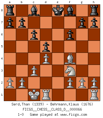 Last move : 1-0 2008 January 27 0:3:57 [Event "FICGS__CHESS__CLASS_D__000066"] [Site "FICGS"] [Date "2007.11.02"] [Round "1"] [White "Serd,Than"] [Black "Behrmann,Klaus"] [Result "1-0"] [WhiteElo "1339"] [BlackElo "1676"] 1.e4 c6 2.d4 d5 3.Nc3 dxe4 4.Nxe4 Nd7 5.Nf3 Ngf6 6.Bd3 e6 7.c3 Nxe4 8.Bxe4 Nf6 9.Qc2 Nxe4 10.Qxe4 Qd5 11.Qxd5 exd5 12.Bf4 f6 13.O-O-O 1-0 Caro-Kann : Steinitz variation Queenside Castling by player White (move 13) Player White won this chess game. Follow this game move after move (download)The only thing Chess players have in common is Chess. (Lodewijk Prins) Je mehr wir mit Computern analysieren, desto mehr glauben wir an Verteidigung. (Vladimir Kramnik) Los problemas de Ajedrez exigen del compositor las mismas virtudes que caracterizan todo el arte de valor: originalidad, invención, concisión, armonía, complejidad e insinceridad explendida. (Vladimir Nabokov) Les Echecs mettent en conflit, non pas deux intelligences, mais deux volontés. (Lasker) As a goal marker shodan is important. As a destination it is a poor place to stop. (Thomas Tamayo)