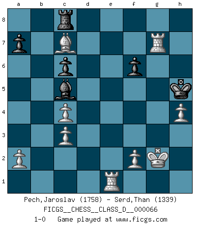 Last move : 1-0 2008 April 24 9:54:40 [Event "FICGS__CHESS__CLASS_D__000066"] [Site "FICGS"] [Date "2007.11.02"] [Round "1"] [White "Pech,Jaroslav"] [Black "Serd,Than"] [Result "1-0"] [WhiteElo "1758"] [BlackElo "1339"] 1.c4 e6 2.Nc3 Nf6 3.e4 d5 4.e5 d4 5.exf6 dxc3 6.bxc3 Qxf6 7.Nf3 e5 8.d4 exd4 9.Bg5 Qe6+ 10.Be2 f6 11.Nxd4 Qf7 12.Bf4 Bc5 13.O-O O-O 14.Re1 Rd8 15.Bd3 Nc6 16.Nxc6 bxc6 17.Bxh7+ Kxh7 18.Qxd8 Bb7 19.Qxc7 Qxc7 20.Bxc7 Ba6 21.Re4 Rc8 22.Bf4 Kg6 23.Rd1 Kf5 24.Rde1 Rd8 25.g4+ Kg6 26.h4 Bc8 27.Kg2 Bxg4 28.Bc7 Rc8 29.Rxg4+ Kh5 30.Rxg7 1-0 English Opening Kingside Castling by player White (move 13) Kingside Castling by player Black (move 13) Player White won this chess game. Follow this game move after move (download)You can only get good at Chess if you love the game. (Bobby Fischer) Schach ist ein Reich, wo sich die menschliche Phantasie frei entfalten kann. (David Bronstein) Fischer no está bajo la obligación de nadie. (Joseph Platz) Les échecs sont un jeu terrible. Si vous n'avez pas le centre, votre adversaire a une position plus libre. Par contre, si vous avez le centre, alors vous avez vraiment quelque chose pour laquelle vous inquiéter ! (Siegbert Tarrasch) There is far too much law for those who can afford it and far too little for those who cannot. (Derek Bok)