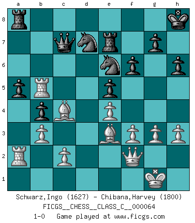 Last move : 1-0 2008 July 30 16:46:35 [Event "FICGS__CHESS__CLASS_C__000064"] [Site "FICGS"] [Date "2007.11.03"] [Round "1"] [White "Schwarz,Ingo"] [Black "Chibana,Harvey"] [Result "1-0"] [WhiteElo "1627"] [BlackElo "1800"] 1.g3 e5 2.Bg2 d5 3.f3 Bc5 4.Nh3 Nf6 5.Nf2 O-O 6.Nc3 Bf5 7.d3 Bxf2+ 8.Kxf2 c6 9.e3 Nbd7 10.Re1 Re8 11.Kg1 b5 12.Bd2 a5 13.e4 dxe4 14.Nxe4 Qc7 15.Qe2 h6 16.Qf2 Rad8 17.b3 Bxe4 18.dxe4 b4 19.a3 c5 20.axb4 cxb4 21.Rec1 Nc5 22.Be3 Nfd7 23.Rd1 Ne6 24.Rd5 Ra8 25.Ra2 Ra6 26.Bf1 R6a8 27.Bb5 Re7 28.h3 f6 29.Bc4 Kh8 30.Rb5 1-0 This chess game has been lost on time (started : 2007.11.03 11:19:9) Benko's Opening Kingside Castling by player Black (move 5) Player White won this chess game. Follow this game move after move (download)Bobby Fischer's current state of mind is indeed a tragedy. One of the world's greatest Chess players - the pride and sorrow of American Chess. (Frank Brady) Woher wissen wir, daß der Neanderthaler Blindschach gespielt hat? -- Bei Ausgrabungen wurden keine Schachbretter und Figuren gefunden. (Anonymous) Alekhine es un poeta que crea un trabajo de arte de algo que raramente inspiraría a otra persona a mandar una tarjeta postal. (Max Euwe) Si je n'étais pas joueur d'échecs, je serais le meilleur dans quelque chose d'autre. (Anatoli Karpov) The Internet is the first thing that humanity has build that humanity doesn't understand, the largest experiment in anarchy that we have ever had. (Eric Schmidt)