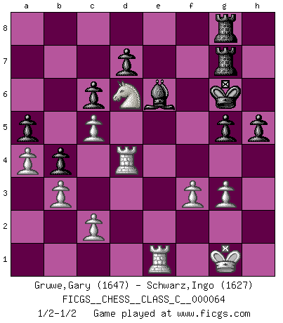 Last move : 1/2-1/2 2008 July 27 14:34:52 [Event "FICGS__CHESS__CLASS_C__000064"] [Site "FICGS"] [Date "2007.11.03"] [Round "1"] [White "Gruwe,Gary"] [Black "Schwarz,Ingo"] [Result "1/2-1/2"] [WhiteElo "1647"] [BlackElo "1627"] 1.d4 g6 2.Nf3 Bg7 3.Nc3 f6 4.e4 Nh6 5.Bf4 Nf7 6.Bc4 c6 7.Qe2 b5 8.Bxf7+ Kxf7 9.O-O a5 10.Rfe1 Ba6 11.Qe3 b4 12.Na4 Bb5 13.Nc5 Na6 14.e5 Nxc5 15.dxc5 Bc4 16.exf6 exf6 17.Nd2 Be6 18.Ne4 Rf8 19.Rad1 Kg8 20.Bh6 Qe7 21.a4 Bxh6 22.Qxh6 Qg7 23.Qxg7+ Kxg7 24.Nd6 h5 25.h4 g5 26.Rd4 Kg6 27.b3 Rg8 28.f3 Rg7 29.Kf2 Rag8 30.g3 Kh7 31.Red1 Kh6 32.Rh1 Kg6 33.Rc1 Kh6 34.Rh1 Kg6 35.hxg5 fxg5 36.Rg1 Kh6 37.Re1 Kg6 38.Kg1 Kh6 39.Kf2 Kg6 40.Kg1 1/2-1/2 Modern defense Kingside Castling by player White (move 9) This chess game ended in a draw. Follow this game move after move (download)Many Chess players were surprised when after the game, Fischer quietly explained: 'I had already analyzed this possibility' in a position which I thought was not possible to foresee from the opening. (Mikhail Tal) Intelligenz läßt sich nicht am Weg, sondern nur am Ergebnis feststellen. (Garry Kasparov) Si tu oponente no puede hacer nada activo, entonces no apures la posición; En vez de eso, dejalo estar sentado ahí, sufriendo y rogandote por un empate. (Jeremy Silman) Tout change constamment, y compris dans le monde des Echecs. (Botvinnik) Thus, what is of supreme importance in war is to attack the enemy's strategy. (Sun Tzu)
