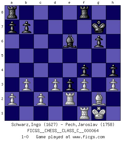 Last move : 1-0 2008 August 11 17:38:49 [Event "FICGS__CHESS__CLASS_C__000064"] [Site "FICGS"] [Date "2007.11.03"] [Round "1"] [White "Schwarz,Ingo"] [Black "Pech,Jaroslav"] [Result "1-0"] [WhiteElo "1627"] [BlackElo "1758"] 1.g3 g6 2.Bg2 Bg7 3.f3 c5 4.Nh3 Nc6 5.Nf2 Nf6 6.Nc3 d5 7.O-O O-O 8.d3 d4 9.Nce4 Nxe4 10.Nxe4 Qb6 11.b3 Nb4 12.Bd2 Nd5 13.Qc1 f5 14.Ng5 f4 15.Bxf4 Nxf4 16.gxf4 Qd6 17.Ne4 Qc7 18.Qa3 Qxf4 19.Qxc5 Be5 20.Ng3 h5 21.Rae1 h4 22.Qc4+ Kg7 23.e3 dxe3 24.Qxf4 Bxf4 25.Ne2 e5 26.Nxf4 exf4 27.h3 Be6 28.Re2 1-0 This chess game has been lost on time (started : 2007.11.03 11:19:9) Benko's Opening Kingside Castling by player White (move 7) Kingside Castling by player Black (move 7) Player White won this chess game. Follow this game move after move (download)The passion for playing Chess is one of the most unaccountable in the world. (H.G. Wells) Bis zum Jahr 1971 verlief in meiner Schachkariere alles glatt. Dieses dramatische Match [Fischer-Taimanov 6:0] machte mein Leben zur Hölle. (Mark Taimanov) El ganar no lo es todo... pero el perder es nada. (Mednis) Votre seul travail dans les ouvertures est d'obtenir un milieu de partie jouable. (Lajos Portish) Macintosh - we might not get everything right, but at least we knew the century was going to end. (Douglas Adams)