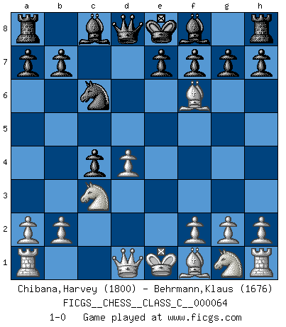 Last move : 1-0 2007 December 20 9:28:25 [Event "FICGS__CHESS__CLASS_C__000064"] [Site "FICGS"] [Date "2007.11.03"] [Round "1"] [White "Chibana,Harvey"] [Black "Behrmann,Klaus"] [Result "1-0"] [WhiteElo "1800"] [BlackElo "1676"] 1.e4 c6 2.d4 d5 3.exd5 cxd5 4.c4 Nf6 5.Nc3 Nc6 6.Bg5 dxc4 7.Bxf6 1-0 This chess game has been lost on time (started : 2007.11.03 11:19:9) Caro-Kann : Panov-Botvinnik attack Player White won this chess game. Follow this game move after move (download)Avoid the crowd. Do your own thinking independently. Be the Chess player, not the Chess piece. (Ralph Charell) Schach ist mein Leben, meine Leidenschaft, was ich gelernt habe und seit meinem 14. Lebensjahr profimässig praktiziere. Darauf zu verzichten, würde mir sehr schwer fallen. (Viktor Kortschnoi) Cuando tu no sabes absolutamente que mas hacer, es tiempo de entrar en pánico. (John van der Wiel) D'abord les bases : Jouez et étudiez, puis étudiez et jouez, ensuite jouez et étudiez, puis étudiez et jouez. Deuxièmement : Donnez toujours le meilleur de vous-même ! (Ken Smith) To err is human, but to really foul things up requires a computer. (Farmer's Almanac, 1978)