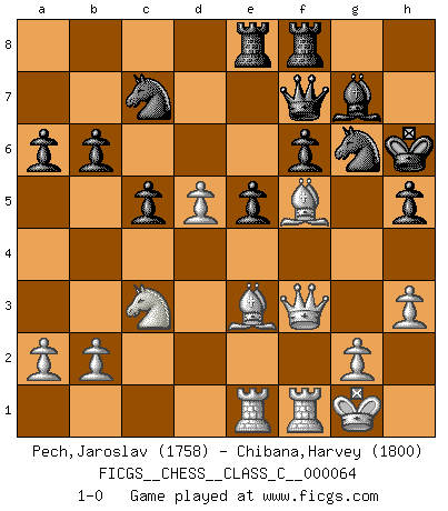Last move : 1-0 2008 July 27 21:9:9 [Event "FICGS__CHESS__CLASS_C__000064"] [Site "FICGS"] [Date "2007.11.03"] [Round "1"] [White "Pech,Jaroslav"] [Black "Chibana,Harvey"] [Result "1-0"] [WhiteElo "1758"] [BlackElo "1800"] 1.d4 Nf6 2.c4 g6 3.Nc3 Bg7 4.e4 d6 5.Nf3 O-O 6.Be2 c5 7.d5 e6 8.O-O exd5 9.cxd5 Bg4 10.h3 Bxf3 11.Bxf3 Nbd7 12.Bf4 Ne8 13.Qd2 Ne5 14.Be2 Nc7 15.Bg5 f6 16.Bh4 h5 17.f4 Nf7 18.Rae1 Qd7 19.Qe3 Rae8 20.Qg3 Kh7 21.Bd3 Nh8 22.Qf3 a6 23.f5 Kh6 24.e5 dxe5 25.fxg6 Nxg6 26.Bf5 Qf7 27.Bf2 b6 28.Be3+ 1-0 King's Indian : 6.Be2 Kingside Castling by player Black (move 5) Kingside Castling by player White (move 8) Player White won this chess game. Follow this game move after move (download)We cannot resist the fascination of sacrifice, since a passion for sacrifices is part of a Chessplayer's nature. (Rudolf Spielman) Viele Opfer benötigen überhaupt keine konkrete Berechnung. Es genügt sich die entstehende Position kurz vorzustellen, um uns davon zu überzeugen, dass das Opfer korrekt ist. (Mikhail Nekhemyevich Tal) El Ajedrez, como cualquier otra actividad creativa, puede existir solo a través de méritos combinados de aquellos que tienen talento creativo y de aquellos que tienen la habilidad de organizar un trabajo creativo. (Mikhail Botvinnik) Les échecs sont un jeu par leur forme, un art par leur essence et une science par sa difficulté d'acquisition. Ils peuvent vous procurer autant de plaisir qu'un bon livre ou une belle musique, mais vous n'aurez une réelle joie que si vous arrivez à bien jouer. (Tigran Petrosian) Tomorrow's what you make of it. (Horatio Caine, C.S.I. Miami)
