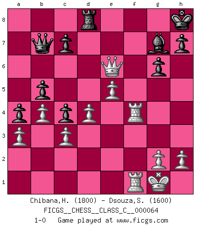 Last move : 1-0 2008 January 8 19:7:45 [Event "FICGS__CHESS__CLASS_C__000064"] [Site "FICGS"] [Date "2007.11.03"] [Round "1"] [White "Chibana,Harvey"] [Black "Dsouza,Stanislaus"] [Result "1-0"] [WhiteElo "1800"] [BlackElo "1600"] 1.e4 b6 2.d4 Bb7 3.Bd3 g6 4.f4 Bg7 5.Nf3 e6 6.Be3 Nf6 7.Nc3 d5 8.e5 Nfd7 9.b4 Nc6 10.a3 O-O 11.O-O a6 12.Ne2 b5 13.c3 f6 14.Bf2 fxe5 15.Bh4 Qe8 16.fxe5 Nb6 17.Qc2 Nc4 18.Bxc4 dxc4 19.Ng5 Qd7 20.Nf4 Rae8 21.Ne4 Qc8 22.Nc5 a5 23.Qe2 a4 24.Qg4 Rxf4 25.Rxf4 Nd8 26.Bxd8 Rxd8 27.Nxb7 Qxb7 28.Qxe6+ Kh8 29.Raf1 1-0 Owen defense Kingside Castling by player Black (move 10) Kingside Castling by player White (move 11) Player White won this chess game. Follow this game move after move (download)A thorough understanding of the typical mating continuations makes the most complicated sacrificial combinations leading up to them not only not difficult, but almost a matter of course. (Siegbert Tarrasch) Alle Schachspieler sollten auch ein Hobby haben. (Savielly Grigorievitsch Tartakower) El Ajedrez es un cuento de Hadas de las 1001 metidas de pata. (Savielly Tartakower) Le génie consiste à savoir transgresser les règles au moment opportun. (Teichmann) Employ the attack like tactic of defense. (Chinese proverb)