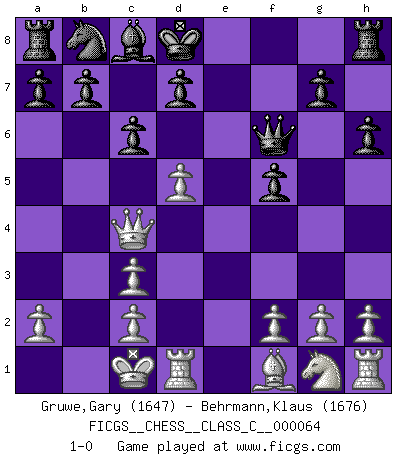 Last move : 1-0 2008 January 27 12:5:49 [Event "FICGS__CHESS__CLASS_C__000064"] [Site "FICGS"] [Date "2007.11.03"] [Round "1"] [White "Gruwe,Gary"] [Black "Behrmann,Klaus"] [Result "1-0"] [WhiteElo "1647"] [BlackElo "1676"] 1.d4 f5 2.Nc3 Nf6 3.Bg5 e6 4.e4 h6 5.Bxf6 Qxf6 6.exf5 exf5 7.Qe2+ Kd8 8.O-O-O c6 9.d5 Bb4 10.Qc4 Bxc3 11.bxc3 1-0 Dutch Queenside Castling by player White (move 8) Player White won this chess game. Follow this game move after move (download)Chess is a sea in which a gnat may drink and an elephant may bathe. (Hindu proverb) Sicherlich können nur Meister einen Stil haben. Daß ein nicht-Meister auch nur ein einziges Mal in seinem Leben eine Partie folgerecht durchführte, habe ich niemals bemerkt. (Emanuel Lasker) Un entendimiento minucioso de las típicas continuaciones de mate hacen de las mas complicadas combinaciones de sacrificio que conducen hacia ellas no solo no dificiles, sino casi un asunto de rutina. (Siegbert Tarrasch) Il n'y a plus de joueurs du niveau de Jacob Murray dont la seule quête est le beau jeu, le plaisir de voir les pièces construire quelque chose. Sur 10 idées à la minute, 9 seront sans intérêt, la dernière s'avèrera géniale. (Christian Bauer) No, I am still playing. (Anatoly Karpov)
