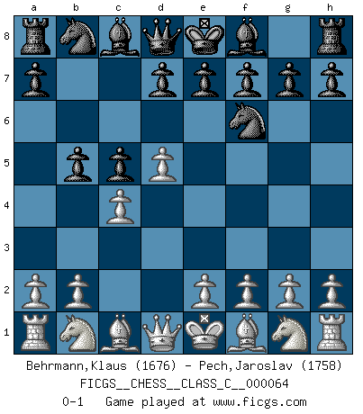 Last move : 0-1 2008 January 6 10:47:29 [Event "FICGS__CHESS__CLASS_C__000064"] [Site "FICGS"] [Date "2007.11.03"] [Round "1"] [White "Behrmann,Klaus"] [Black "Pech,Jaroslav"] [Result "0-1"] [WhiteElo "1676"] [BlackElo "1758"] 1.d4 Nf6 2.c4 c5 3.d5 b5 0-1 This chess game has been lost on time (started : 2007.11.03 11:19:9) Benko gambit Player Black won this chess game. Follow this game move after move (download)Chess makes man wiser and clear-sighted. (Vladimir Putin) Die starken Figuren des Gegners muss man abtauschen. (José Raúl Capablanca) El Ajedrez lo es todo: arte, ciencia y deporte. (Anatoly Karpov) Si rien de grave n'est détecté lors de l'analyse d'une position, on joue alors le coup. Seconde règle de Blumenfeld. You must have a dream in order to have it come true. (A.P.J. Kalam)