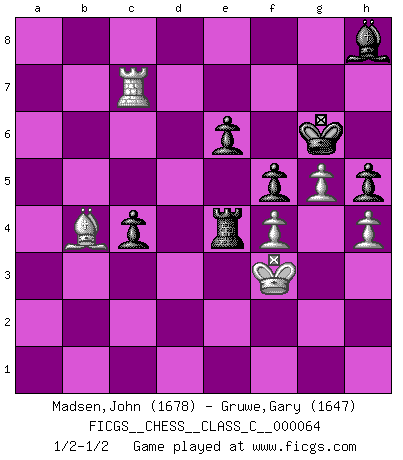 Last move : 1/2-1/2 2008 February 28 17:51:31 [Event "FICGS__CHESS__CLASS_C__000064"] [Site "FICGS"] [Date "2007.11.03"] [Round "1"] [White "Madsen,John"] [Black "Gruwe,Gary"] [Result "1/2-1/2"] [WhiteElo "1678"] [BlackElo "1647"] 1.f4 Nf6 2.e3 d5 3.Nf3 g6 4.Bb5+ c6 5.Be2 Bg7 6.c4 O-O 7.Nc3 c5 8.d4 cxd4 9.Nxd4 Nc6 10.Nxc6 bxc6 11.O-O Qd6 12.a3 Be6 13.g4 Rfd8 14.g5 Ne8 15.Qa4 Bf5 16.cxd5 cxd5 17.Bf3 e6 18.Ne2 Qb6 19.Nd4 Nd6 20.Qb4 Qc7 21.Nxf5 gxf5 22.Qa4 Qb6 23.Rb1 Rac8 24.Kh1 Rc6 25.Be2 Ne4 26.Bd3 Nc5 27.Qc2 Rdc8 28.Bd2 Nxd3 29.Qxd3 Bxb2 30.Rf2 Rc2 31.Kg1 Qc7 32.Qb3 Rb8 33.Qd3 Qc4 34.Qxc4 dxc4 35.Be1 Rxf2 36.Kxf2 Rb3 37.Ke2 Bxa3 38.Rd1 Rb2+ 39.Kf3 Rc2 40.Rd8+ Kg7 41.Rc8 Bb2 42.Bb4 Kg6 43.h4 Rh2 44.Be1 Rc2 45.Bb4 h5 46.Rg8+ Kh7 47.Ra8 Rh2 48.Rxa7 Rh3+ 49.Kg2 Rxe3 50.Rxf7+ Kg6 51.Rc7 Re4 52.Kf3 Bh8 1/2-1/2 Bird's Opening Kingside Castling by player Black (move 6) Kingside Castling by player White (move 11) This chess game ended in a draw. Follow this game move after move (download)I have never in my life played the French Defence, which is the dullest of all openings. (Wilhelm Steinitz) Vom Schach wurde gesagt das Leben sei dafür nicht lange genug. Aber das ist der Fehler des Lebens, nicht des Schach'. (Irving Chernev) Aquellos que dicen entender al Ajedrez, no entienden nada. (Robert Hubner) La menace est plus forte que l'exécution. (Aaron Nimzovitch) Creativity involves breaking out of established patterns in order to look at things in a different way. (Edward De Bono)
