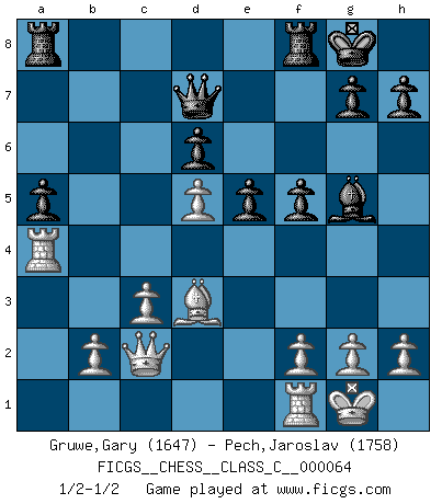 Last move : 1/2-1/2 2008 May 20 18:58:51 [Event "FICGS__CHESS__CLASS_C__000064"] [Site "FICGS"] [Date "2007.11.03"] [Round "1"] [White "Gruwe,Gary"] [Black "Pech,Jaroslav"] [Result "1/2-1/2"] [WhiteElo "1647"] [BlackElo "1758"] 1.e4 c5 2.Nf3 Nc6 3.d4 cxd4 4.Nxd4 Nf6 5.Nc3 e5 6.Ndb5 d6 7.Bg5 a6 8.Na3 b5 9.Nd5 Be7 10.Bxf6 Bxf6 11.c3 O-O 12.Nc2 Bg5 13.Bd3 Ne7 14.Ncb4 Bb7 15.O-O f5 16.a4 a5 17.Nxe7+ Qxe7 18.Nd5 Bxd5 19.exd5 bxa4 20.Rxa4 Qd7 21.Qc2 1/2-1/2 Sicilian : Pelikan (Lasker/Sveshnikov) variation Kingside Castling by player Black (move 11) Kingside Castling by player White (move 15) This chess game ended in a draw. Follow this game move after move (download)I won't play with you anymore. You have insulted my friend. - When an opponent cursed himself for a blunder. (Miguel Najdorf) Ich bin es gewohnt, das die Jugend mir überhaupt keinen Respekt entgegenbringt. (Alexander Morozewich) ¡Examina movidas que hagan daño! Un buen ojo for movidas desvastantes es mucho mas importante que el conocimiento de principios estratégicos. (Purdy) Echiquier : carré parfait, comme la Jérusalem nouvelle décrite par l'auteur de l'Apocalypse, huit cases sur huit, exaltation du chiffre 4, symbole du cosmos aux quatre horizons... où le noir et le blanc, l'ombre et la lumière, le mal et le bien s'entremêlent et se conjuguent. (Robert Couffignal, Le Gambit du poète) All the troubles of the world come from being unable to sit alone in a quiet room. (Blaise Pascal)