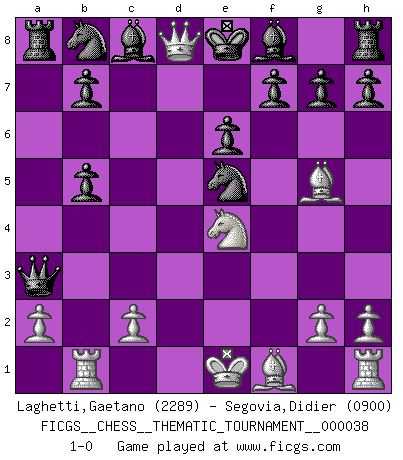 Last move : 1-0 2007 November 11 1:18:14 [Event "FICGS__CHESS__THEMATIC_TOURNAMENT__000038"] [Site "FICGS"] [Date "2007.11.03"] [Round "1"] [White "Laghetti,Gaetano"] [Black "Segovia,Didier"] [Result "1-0"] [WhiteElo "2289"] [BlackElo "0900"] 1.e4 c5 2.Nf3 d6 3.d4 cxd4 4.Nxd4 Nf6 5.Nc3 a6 6.Bg5 e6 7.f4 Qb6 8.Qd2 Qxb2 9.Rb1 Qa3 10.e5 dxe5 11.fxe5 Nfd7 12.Ne4 Nxe5 13.Nb5 axb5 14.Qd8+ 1-0 Sicilian : Najdorf, 7...Qb6 Player White won this chess game. Follow this game move after move (download)The sign of a great Master is his ability to win a won game quickly and painlessly. (Irving Chernev) Drei Punkte vor allen anderen ist wie einer, der im weißen Anzug posiert, während der Rest in Müllsäcke gekleidet dasteht. (Viktor Kortschnoi) Siempre es mejor sacrificar los hombres de tu oponente. (Savielly Tartakower) Pour moi, les échecs ne sont pas un jeu mais un art. (Alexandre Alekhine) When you have everything, sometimes it feels like nothing. (Horatio Caine, C.S.I. Miami)