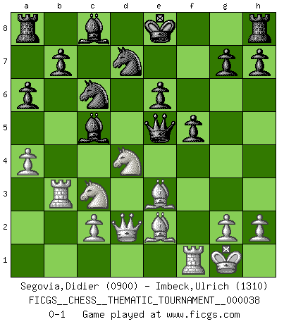 Last move : 0-1 2007 December 21 9:29:39 [Event "FICGS__CHESS__THEMATIC_TOURNAMENT__000038"] [Site "FICGS"] [Date "2007.11.03"] [Round "1"] [White "Segovia,Didier"] [Black "Imbeck,Ulrich"] [Result "0-1"] [WhiteElo "0900"] [BlackElo "1310"] 1.e4 c5 2.Nf3 d6 3.d4 cxd4 4.Nxd4 Nf6 5.Nc3 a6 6.Bg5 e6 7.f4 Qb6 8.Qd2 Qxb2 9.Rb1 Qa3 10.e5 dxe5 11.fxe5 Nfd7 12.Rb3 Qa5 13.a4 Qxe5+ 14.Be2 Bc5 15.Be3 f5 16.O-O Nc6 0-1 This chess game has been lost on time (started : 2007.11.03 23:58:27) Sicilian : Najdorf, 7...Qb6 Kingside Castling by player White (move 16) Player Black won this chess game. Follow this game move after move (download)Chess is so inspiring that I do not believe a good player is capable of having an evil thought during the game. (Wilhelm Steinitz) Kombinieren und Schwarzhandel gehören verboten. (Savielly Grigorievitsch Tartakower) ¡Examina movidas que hagan daño! Un buen ojo for movidas desvastantes es mucho mas importante que el conocimiento de principios estratégicos. (Purdy) Un millionnaire : 'Monsieur Steinitz ! Vous ne participez aux tournois que pour l'argent, alors que moi je n'y viens que pour l'honneur.' Steinitz : 'Chacun joue pour ce qu'il n'a pas'... Unless I accept my faults I will most certainly doubt my virtues. (Hugh Prather)