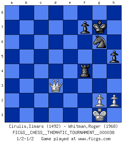 Last move : 1/2-1/2 2008 April 21 10:6:43 [Event "FICGS__CHESS__THEMATIC_TOURNAMENT__000038"] [Site "FICGS"] [Date "2007.11.03"] [Round "1"] [White "Cirulis,Ilmars"] [Black "Whitman,Roger"] [Result "1/2-1/2"] [WhiteElo "1492"] [BlackElo "1968"] 1.e4 c5 2.Nf3 d6 3.d4 cxd4 4.Nxd4 Nf6 5.Nc3 a6 6.Bg5 e6 7.f4 Qb6 8.Qd2 Qxb2 9.Rb1 Qa3 10.e5 dxe5 11.fxe5 Nfd7 12.Ne4 h6 13.Bh4 Qxa2 14.Rd1 Qd5 15.Qe3 Qxe5 16.Be2 Bc5 17.Bg3 Bxd4 18.Rxd4 Qa5+ 19.Rd2 O-O 20.Bd6 Rd8 21.Qg3 Qf5 22.Be5 Qg6 23.Qh4 Nc6 24.Bh5 Qf5 25.Bxg7 Nc5 26.Nxc5 Kxg7 27.Rf1 Qe5+ 28.Ne4 Qa1+ 29.Rd1 Rxd1+ 30.Bxd1 Qe5 31.Rf6 Qxe4+ 32.Qxe4 Kxf6 33.Qh4+ Kg7 34.Bh5 e5 35.Qg3+ Kf8 36.Qb3 Nd8 37.Qd5 Be6 38.Qxe5 a5 39.Bf3 Kg8 40.Qb5 Kg7 41.Qa4 Nc6 42.Kf2 Rc8 43.Qb5 Nb4 44.Qxa5 Rxc2+ 45.Kg3 Nd3 46.Bxb7 Rc5 47.Qd2 Rg5+ 48.Kf3 Bd5+ 49.Bxd5 Rxd5 50.Qc3+ Ne5+ 51.Kf4 Rc5 52.Qg3+ Ng6+ 53.Ke4 Re5+ 54.Kf3 Rg5 55.Qe1 Rf5+ 56.Kg3 Rg5+ 57.Kf2 Rf5+ 58.Kg1 h5 59.Qe4 Rf4 60.Qd3 1/2-1/2 Sicilian : Najdorf, 7...Qb6 Kingside Castling by player Black (move 19) 10 pieces endgame at move 49 : White KQBPP , Black KRNPP WHITE : King + 1 Queen 1 Bishop 2 Pawns BLACK : King + 1 Rook 1 Knight 2 Pawns 9 pieces endgame at move 49 : White KQPP , Black KRNPP WHITE : King + 1 Queen 2 Pawns BLACK : King + 1 Rook 1 Knight 2 Pawns This chess game ended in a draw. Follow this game move after move (download)Chess is ruthless: you've got to be prepared to kill people. (Nigel Short) Wenn du nicht weißt was du tun sollst, warte bis dein Gegner eine Idee hat. Sie wird sicher schlecht sein. (Siegbert Tarrasch) En la vida, como en el Ajedrez, los Peones propios obstruyen nuestro camino. La gran fortuna de un hombre, su comodidad, placer, hijos, libros, que deberían ayudarle a ganar, con mucha frecuencia lo ponen en Jaque Mate. (Charles Buxton) Echiquier : carré parfait, comme la Jérusalem nouvelle décrite par l'auteur de l'Apocalypse, huit cases sur huit, exaltation du chiffre 4, symbole du cosmos aux quatre horizons... où le noir et le blanc, l'ombre et la lumière, le mal et le bien s'entremêlent et se conjuguent. (Robert Couffignal, Le Gambit du poète) God is an atheist. (Unknown)