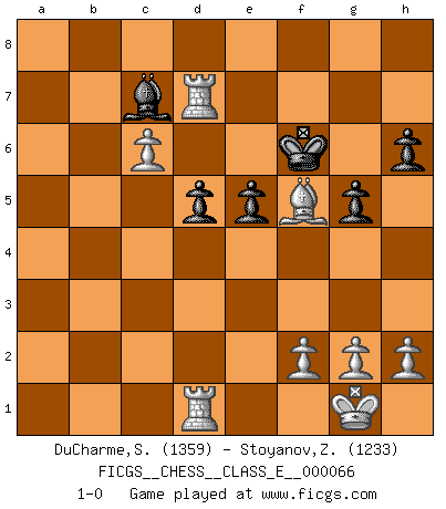 Last move : 1-0 2007 December 7 19:52:8 [Event "FICGS__CHESS__CLASS_E__000066"] [Site "FICGS"] [Date "2007.11.05"] [Round "1"] [White "DuCharme,Steven"] [Black "Stoyanov,Zdravko"] [Result "1-0"] [WhiteElo "1359"] [BlackElo "1233"] 1.Nf3 d6 2.d4 h6 3.e4 Bg4 4.Be2 Bxf3 5.Bxf3 a6 6.O-O Nc6 7.c4 Na5 8.Qa4+ Nc6 9.d5 b5 10.cxb5 axb5 11.Qxb5 Qd7 12.dxc6 Qc8 13.Nc3 Nf6 14.Be3 e5 15.Nd5 Nxd5 16.exd5 Rb8 17.Bg4 Rxb5 18.Bxc8 Rxd5 19.Bd7+ Ke7 20.Rfd1 Rb5 21.b3 g5 22.Rab1 Bg7 23.a4 Ra5 24.Bd2 Ra6 25.a5 f5 26.b4 Rb8 27.b5 R6a8 28.Bxf5 d5 29.b6 cxb6 30.axb6 Rf8 31.Bb4+ Kf6 32.Bxf8 Bxf8 33.b7 Re8 34.b8Q Rxb8 35.Rxb8 Bd6 36.Rd8 Bc7 37.Rd7 1-0 Reti Opening Kingside Castling by player White (move 6) Promotion Queen by player White (move 34) Player White won this chess game. Follow this game move after move (download)Methodical thinking is of more use in Chess than inspiration. (C. J. S. Purdy) Schon mancher Spieler hat aufgegeben, um zu vermeiden, daß er eine Figur verliert. (Savielly Grigorievitsch Tartakower) El jugador táctico sabe que hacer cuando hay algo que hacer; mientras que el estratega sabe que hacer cuando no hay nada que hacer. (Gerald Abrahams) C'est la seule position que je connaisse où les deux camps sont mals. Propos prêtés à V. Anand. Depression is just anger without enthusiasm. (Unknown)