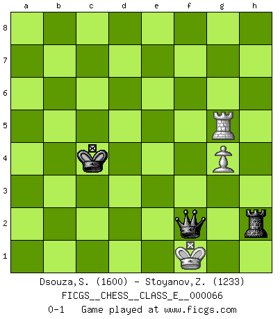 Last move : 0-1 2007 November 30 20:28:22 [Event "FICGS__CHESS__CLASS_E__000066"] [Site "FICGS"] [Date "2007.11.05"] [Round "1"] [White "Dsouza,Stanislaus"] [Black "Stoyanov,Zdravko"] [Result "0-1"] [WhiteElo "1600"] [BlackElo "1233"] 1.d4 d5 2.Nf3 e6 3.Bf4 h6 4.e3 Bd6 5.Bxd6 Qxd6 6.c3 Nf6 7.Nbd2 a6 8.Ne5 Nc6 9.Ndf3 O-O 10.Bd3 Nd7 11.Nxc6 Qxc6 12.O-O b5 13.Re1 Nb6 14.Ne5 Qd6 15.Qg4 Nd7 16.f4 Nf6 17.Qg3 b4 18.Ng4 Nxg4 19.Qxg4 e5 20.Bf5 e4 21.Rec1 a5 22.c4 c5 23.cxd5 Bxf5 24.Qxf5 cxd4 25.Qxe4 dxe3 26.Qxe3 Qxd5 27.Rc5 Qd6 28.Qe5 Qxe5 29.Rxe5 Rfe8 30.Rae1 Rxe5 31.Rxe5 f6 32.Rd5 Kf7 33.a3 Ke6 34.Rb5 bxa3 35.bxa3 a4 36.Kf2 g5 37.fxg5 hxg5 38.g4 Rc8 39.Ra5 Rc4 40.h3 Rc3 41.Kg2 Rxa3 42.Kh2 Kd6 43.Kg2 Ra2+ 44.Kg3 a3 45.Kf3 Ra1 46.Kf2 a2 47.Kg2 Kc6 48.Kf2 Kb6 49.Ra3 Kb5 50.Ke2 Kb4 51.Ra6 Kb3 52.Rb6+ Kc4 53.Ra6 Rh1 54.Rc6+ Kb5 55.Rxf6 a1Q 56.Rf5+ Kc4 57.Rxg5 Rxh3 58.Kf2 Qa2+ 59.Kg1 Rh2 60.Kf1 Qf2+ 0-1 Queen's pawn game Kingside Castling by player Black (move 9) Kingside Castling by player White (move 12) 10 pieces endgame at move 37 : White KRPPP , Black KRPPP WHITE : King + 1 Rook 3 Pawns BLACK : King + 1 Rook 3 Pawns 9 pieces endgame at move 41 : White KRPP , Black KRPPP WHITE : King + 1 Rook 2 Pawns BLACK : King + 1 Rook 3 Pawns 8 pieces endgame at move 55 : White KRPP , Black KRPP WHITE : King + 1 Rook 2 Pawns BLACK : King + 1 Rook 2 Pawns Promotion Queen by player Black (move 55) 7 pieces endgame at move 57 : White KRPP , Black KQR WHITE : King + 1 Rook 2 Pawns BLACK : King + 1 Queen 1 Rook 6 pieces endgame at move 57 : White KRP , Black KQR WHITE : King + 1 Rook 1 Pawn BLACK : King + 1 Queen 1 Rook Player Black won this chess game. Follow this game move after move (download)Chess is thirty to forty percent psychology. You don't have this when you play a computer. I can't confuse it. (Judith Polgar) Das Schachspiel ist ein See, in welchem eine Mücke baden und ein Elefant ertrinken kann. (Emanuel Lasker) Evita las multitudes. Haz independientemente tu propio razonamiento. Trata de ser el jugador de Ajedrez, no la pieza de Ajedrez. (Ralph Charell) Toute estimation doit être constamment réévaluée. (Jacob Estrin) There are two types of people in this world, good and bad. The good sleep better, but the bad seem to enjoy the waking hours much more. (Woody Allen)