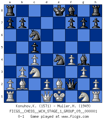 Last move : 0-1 2006 July 29 21:4:0 [Event "FICGS__CHESS__WCH_STAGE_1_GROUP_09__000001"] [Site "FICGS"] [Date "2006.07.01"] [Round "1"] [White "Konuhov,Konstantin"] [Black "Muller,Henri-Louis"] [Result "0-1"] [WhiteElo "1571"] [BlackElo "1949"] 1.e4 c5 2.f4 d5 3.exd5 Nf6 4.c4 e6 5.dxe6 Bxe6 6.g3 Nc6 7.b3 Bg4 8.Be2 Qd4 9.Nc3 Ne4 10.Bb2 Qf2+ 0-1 Sicilian : Grand Prix attack Player Black won this chess game. Follow this game move after move (download)By this measure (on the gap between Fischer & his contemporaries), I consider him the greatest world champion. (Garry Kasparov) Das Blackmar-Diemer-Gambit verändert den ganzen Menschen! (Emil Joseph Diemer) Realmente no sabemos como el juego fue inventado, aunque hay sospechas. Tan pronto como descubramos a los culpables, se los haremos saber. (Bruce Pandolfini) À la honte des hommes, on sait que les lois du jeu sont les seules qui soient partout justes, claires, inviolables et exécutées. Pourquoi l'Indien qui a donné les règles du jeu d'échecs est-il obéi de bon gré dans toute la terre, et que les décrétales des papes, par exemple, sont aujourd'hui un objet d'horreur et de mépris ? C'est que l'inventeur des échecs combina tout avec justesse pour la satisfaction des joueurs, et que les papes, dans leurs décrétales, n'eurent en vue que leur seul avantage. L'Indien voulut exercer également l'esprit des hommes et leur donner du plaisir; les papes ont voulu abrutir l'esprit des hommes. Voltaire (Dictionnaire philosophique / Garnier 1967) God is an atheist. (Unknown)