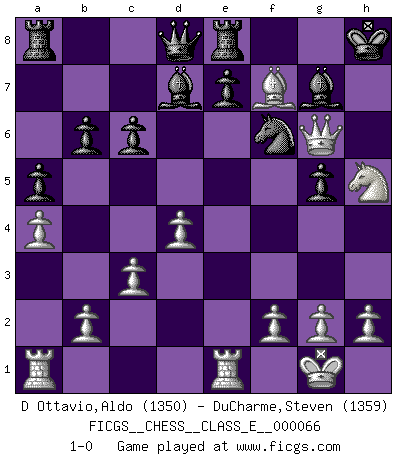 Last move : 1-0 2007 December 20 16:47:3 [Event "FICGS__CHESS__CLASS_E__000066"] [Site "FICGS"] [Date "2007.11.05"] [Round "1"] [White "D Ottavio,Aldo"] [Black "DuCharme,Steven"] [Result "1-0"] [WhiteElo "1350"] [BlackElo "1359"] 1.e4 c6 2.d4 d5 3.Nc3 dxe4 4.Nxe4 Nd7 5.Nf3 Ngf6 6.Ng3 g6 7.Be2 Bg7 8.O-O O-O 9.Re1 Re8 10.c3 b6 11.a4 a5 12.Bg5 Nf8 13.Ne5 Bd7 14.Bc4 h6 15.Bxf7+ Kh7 16.Qd3 hxg5 17.Nxg6 Nxg6 18.Qxg6+ Kh8 19.Nh5 1-0 Caro-Kann : Steinitz variation Kingside Castling by player White (move 8) Kingside Castling by player Black (move 8) Player White won this chess game. Follow this game move after move (download)The stomach is an essential part of the Chess master. (Bent Larsen) Der 70jährige Viktor Kortschnoi: Die Rentenanstalt wollte mich zwingen in Rente zu gehen. Meine Frau erhält jetzt eine Pension- und ich zahle weiter in die Rentenkasse ein! (Viktor Kortschnoi) No es suficiente ser un buen jugador, se debe también de jugar bién. (Siegbert Tarrasch) Le plus grand jeu de l'esprit jamais inventé, plus vous l'apprenez, plus vous y prenez du plaisir. (Garry Kasparov) I believe in luck. How else can you explain the success of those you dislike ? (Jean Cocteau)