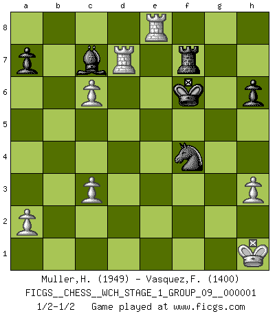 Last move : 1/2-1/2 2006 September 2 20:20:14 [Event "FICGS__CHESS__WCH_STAGE_1_GROUP_09__000001"] [Site "FICGS"] [Date "2006.07.01"] [Round "1"] [White "Muller,Henri-Louis"] [Black "Vasquez,Fernando"] [Result "1/2-1/2"] [WhiteElo "1949"] [BlackElo "1400"] 1.e4 e5 2.Nf3 Nf6 3.Nxe5 d6 4.Nf3 Nxe4 5.d4 d5 6.Bd3 Bd6 7.O-O O-O 8.c4 c6 9.Nc3 Nxc3 10.bxc3 dxc4 11.Bxc4 Bg4 12.Qd3 Nd7 13.Ng5 Nf6 14.h3 Bh5 15.f4 h6 16.g4 b5 17.Bb3 c5 18.Qxb5 hxg5 19.gxh5 gxf4 20.dxc5 Be5 21.c6 Qc7 22.h6 gxh6 23.Qc4 Kh8 24.Bxf4 Rg8+ 25.Kh1 Nh5 26.Qxf7 Nxf4 27.Qxc7 Bxc7 28.Bxg8 Rxg8 29.Rae1 Rg7 30.Rg1 Rf7 31.Re8+ Kh7 32.Rd1 Kg7 33.Rd7 Kf6 1/2-1/2 Petrov : Classical attack, Marshall variation Kingside Castling by player White (move 7) Kingside Castling by player Black (move 7) This chess game ended in a draw. Follow this game move after move (download)When the Chess game is over, the Pawn and the King go back to the same box. (Irish saying) Frage: Wie viele Autos haben Sie schon zerstört? - Antwort: Nur zwei. (Loek van Wely) Las ideas audaces son como las piezas del Ajedrez que avanzan hacia adelante. Ellas pueden ser vencidas, pero también pueden iniciar una partida victoriosa. (Goethe) Les Echecs ne sont pas pour les âmes timides. Ils requièrent un homme entier, qui ne s'arrête pas aveuglément à ce qui a été déjà établi, mais qui tente individuellement de sonder les profondeurs du jeu. (W. Steinitz) You cannot beat a roulette table unless you steal money from it. (Albert Einstein)