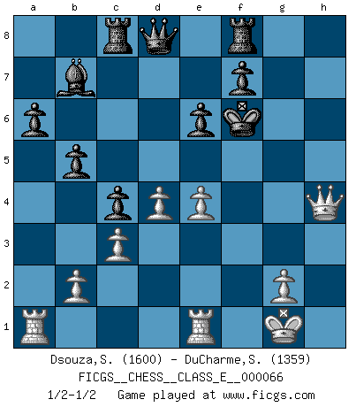 Last move : 1/2-1/2 2007 December 6 20:41:9 [Event "FICGS__CHESS__CLASS_E__000066"] [Site "FICGS"] [Date "2007.11.05"] [Round "1"] [White "Dsouza,Stanislaus"] [Black "DuCharme,Steven"] [Result "1/2-1/2"] [WhiteElo "1600"] [BlackElo "1359"] 1.d4 Nf6 2.e3 d5 3.Bd3 Nbd7 4.Nf3 g6 5.c3 Bg7 6.Nbd2 O-O 7.e4 e6 8.O-O dxe4 9.Nxe4 b6 10.Re1 Bb7 11.Bg5 h6 12.Nxf6+ Nxf6 13.Bh4 a6 14.Ne5 Qd5 15.f3 g5 16.Bg3 b5 17.Qe2 Rac8 18.Rad1 Qxa2 19.h4 c5 20.Ra1 Qd5 21.hxg5 hxg5 22.Kf2 g4 23.Nxg4 Nxg4+ 24.Kg1 Nf6 25.Be5 c4 26.Be4 Nxe4 27.fxe4 Qd8 28.Bxg7 Kxg7 29.Qg4+ Kf6 30.Qh4+ Kg7 31.Qg4+ Kf6 32.Qh4+ 1/2-1/2 Queen's pawn game Kingside Castling by player Black (move 6) Kingside Castling by player White (move 8) This chess game ended in a draw. Follow this game move after move (download)Suddenly it was obvious to me in my analysis I had missed what Fischer had found with the greatest of ease at the board. (Mikhail Botvinnik) Kombinieren und Schwarzhandel gehören verboten. (Savielly Grigorievitsch Tartakower) Una compensación adecuada por un sacrificio es tener una combinación sólida que conduce a una posición ganadora; una compensación adecuada por una metida de pata es dejar a tu oponente arrebatar una derrota de las fauces de la victoria. (Bruce A. Moon) Dieu déplace le joueur, et celui-ci la pièce. Quel Dieu derrière Dieu commence donc la trame ? Arturo Perez-Reverte (prix de littérature policière 1993). To be champion requires more than simply being a strong player; one has to be a strong human being as well. (Anatoly Karpov)